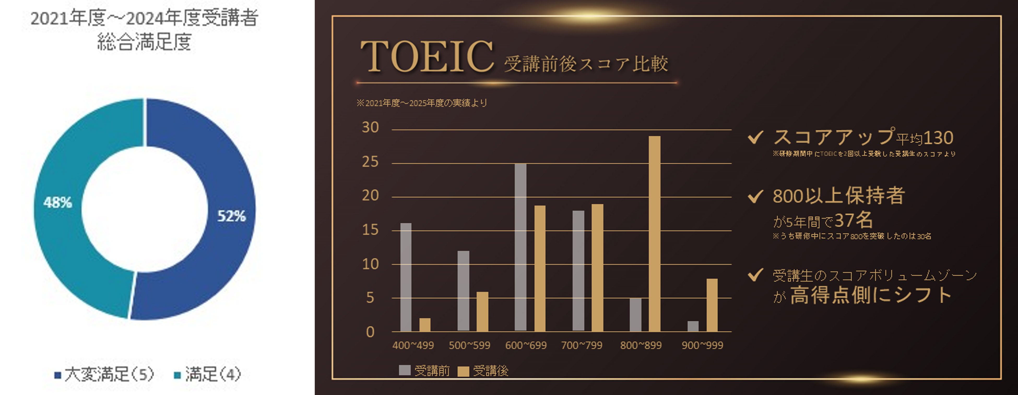 2021年度~2024年度修了者44名を対象に実施した満足度アンケートでは、全体の90%が「満足」と回答しました。また、TOEICスコアは受講前と比較して平均130点アップし、800点以上の保持者は約37名に増加しています。