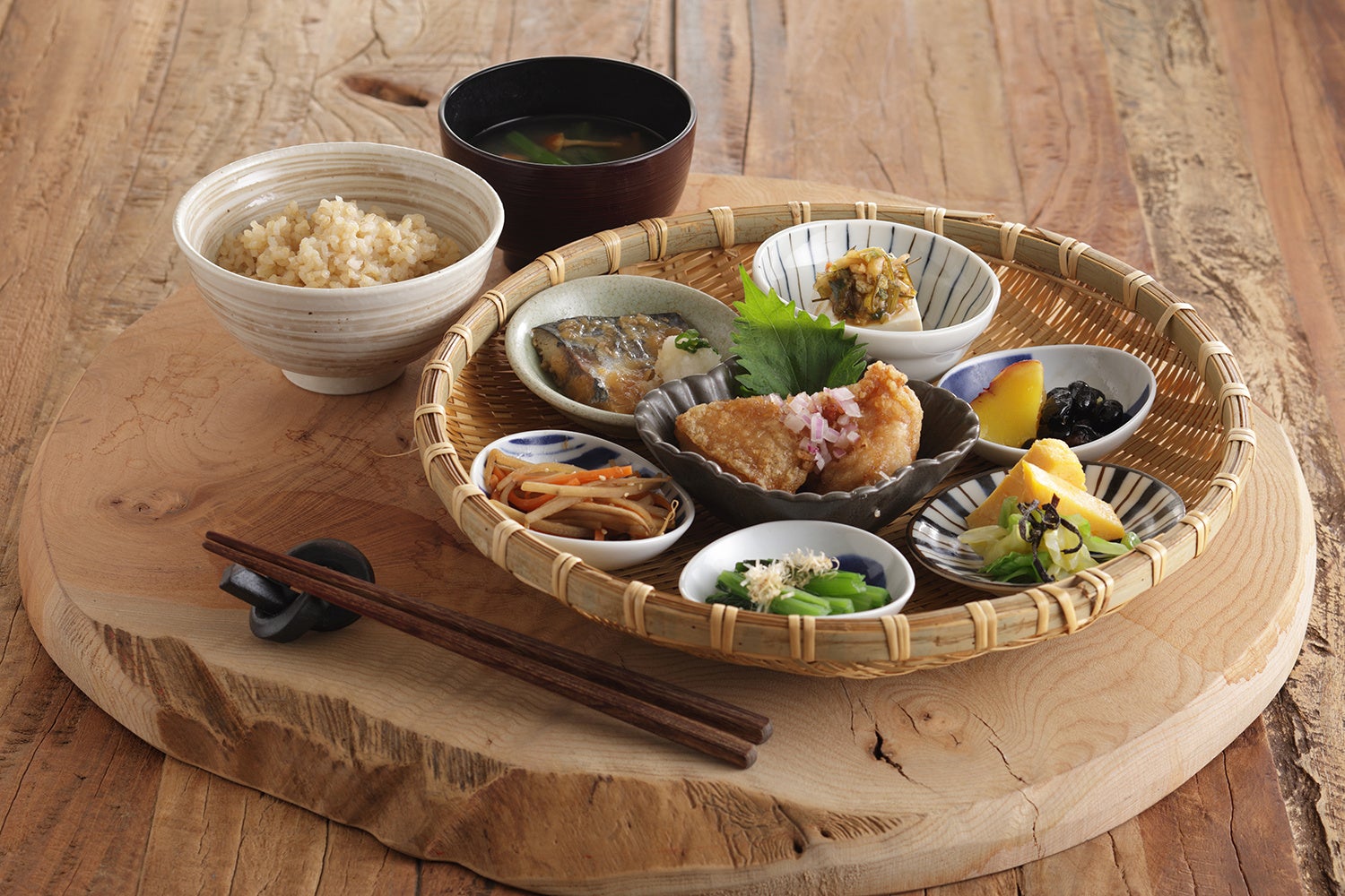 「玄米食堂あえん」では、玄米をより親しみやすい味わいや香り、食感にするために、白米と千葉県産のコシヒカリ玄米を2:8でブレンドした「二八玄米」を使用し、独自の比率や炊き方でふっくらと炊き上げています。おかずや小鉢は、「里山の恵み」を感じていただけるシンプルで優しい味わいで、玄米・肉・魚・野菜など、いろいろな食材をバランスよくお楽しみいただけるメニューをご用意しております。