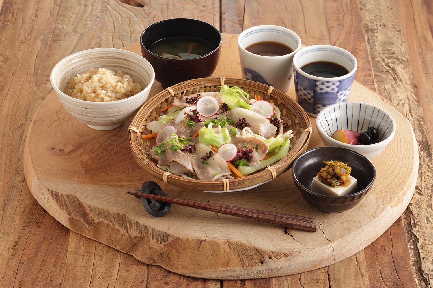桜山豚のざる蒸し、二八玄米ごはん、あごだし麦味噌汁、季節の小鉢