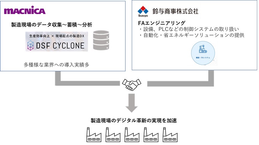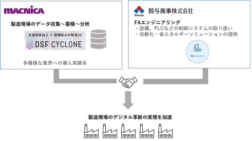 この度、鈴与商事はより多くの製造業のお客様のご支援を行うため、製造現場のデータ活用の知見を有するマクニカとDSF CYCLONEの拡販に向けた協業を開始いたしました。