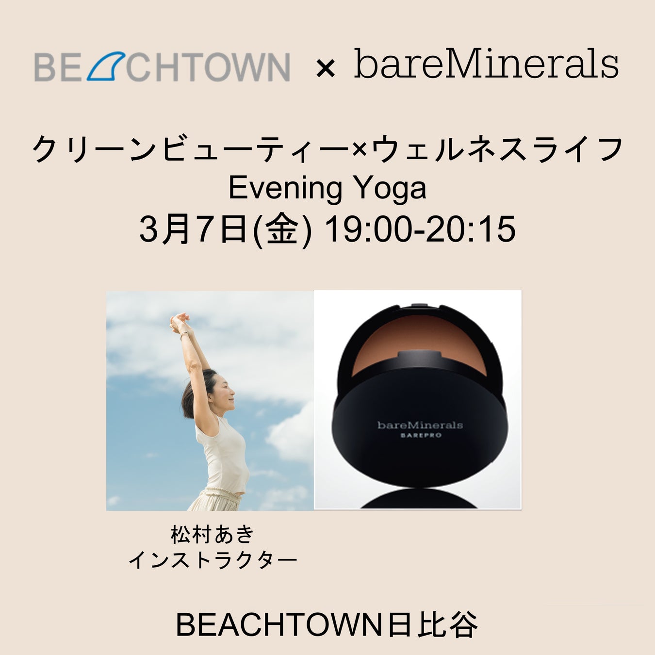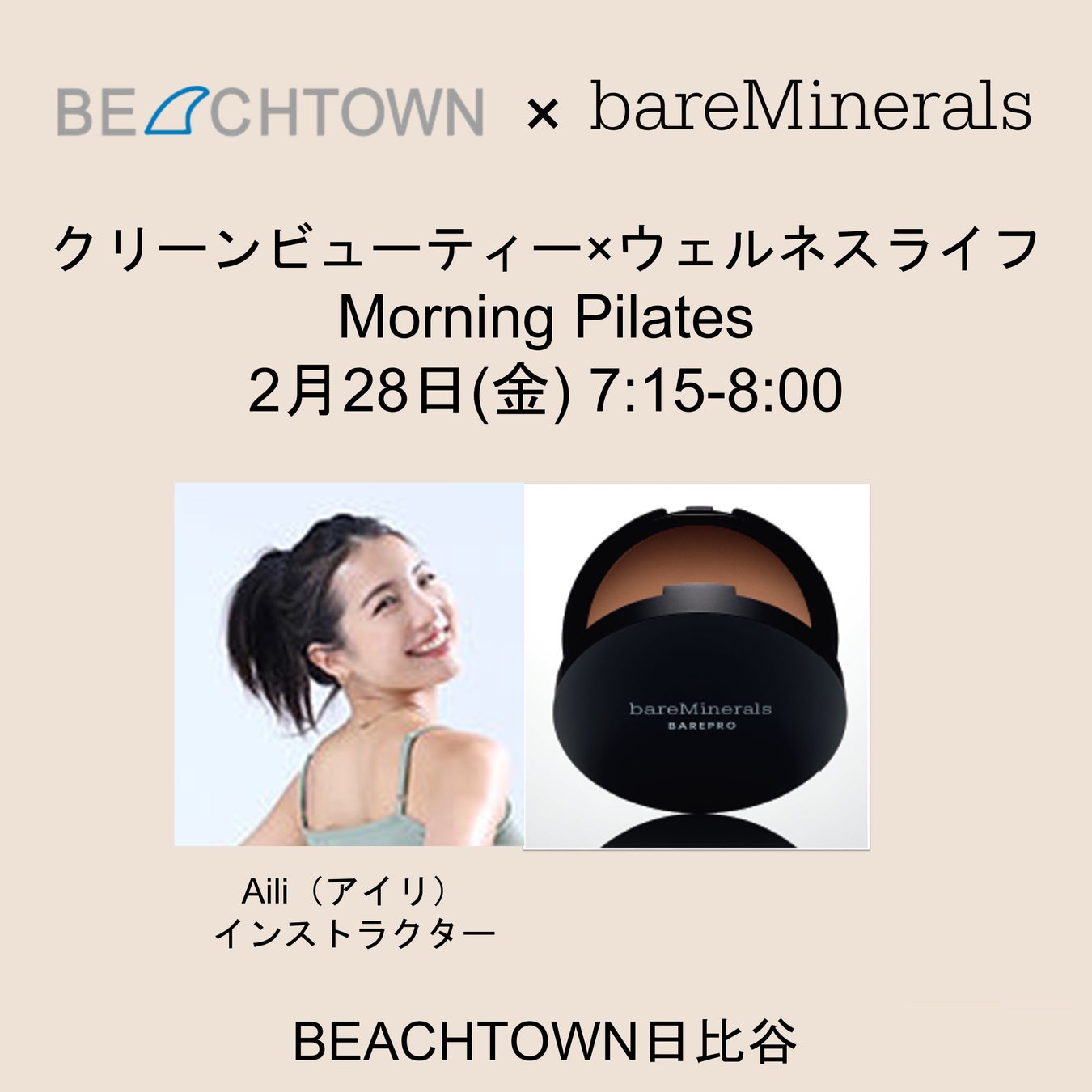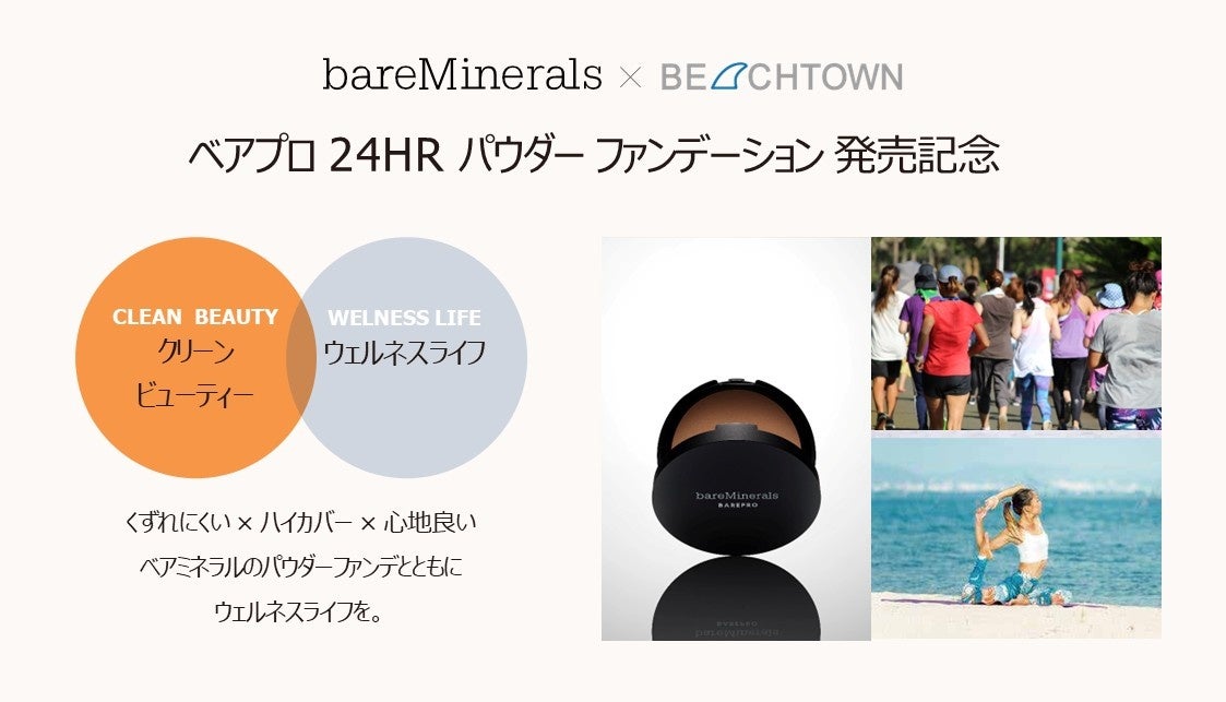 日本でも数年前からトレンドとなったウェルネス。人々の憧れの対象が外見的な美しさから健康的で幸福度の高いライフスタイルへ関心が高まり身体だけでなく、メンタルや環境などの広義で健康を捉える概念。「自分のいのち、社会のいのち、地球のいのち」を企業理念とし、ウェルネスライフを提唱する株式会社BEACH TOWN(ビーチタウン)とクリーンビューティーブランドとしてベアミネラルが掲げる理念が相通じ、コラボレーション開催が実現しました。