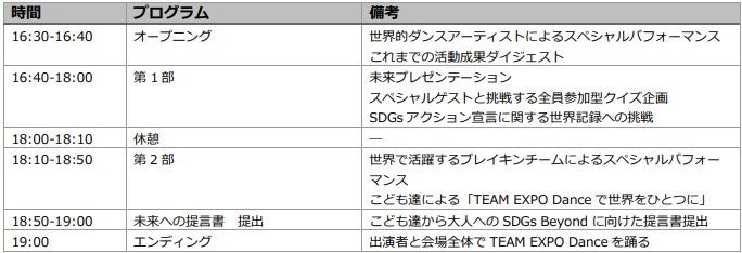 本イベントでは、大人たちによる応援のもと「こどもが主役」となり、こども達の学びや気づきをもとにありたい未来について発表する「未来プレゼンテーション」や、スペシャルゲストと挑戦する会場を巻き込んだ「全員参加型クイズ企画」、SDGsに対する未来へのアクション宣言に関する「世界記録への挑戦」、さらに、こども主体の「TEAM EXPO 2025」共創チャレンジ(※3)の中で最も規模が大きいチャレンジの1つである「TEAM EXPO Danceで世界をひとつに」など、未来に向けたさまざまなワクワクする取り組みに挑戦していきます。