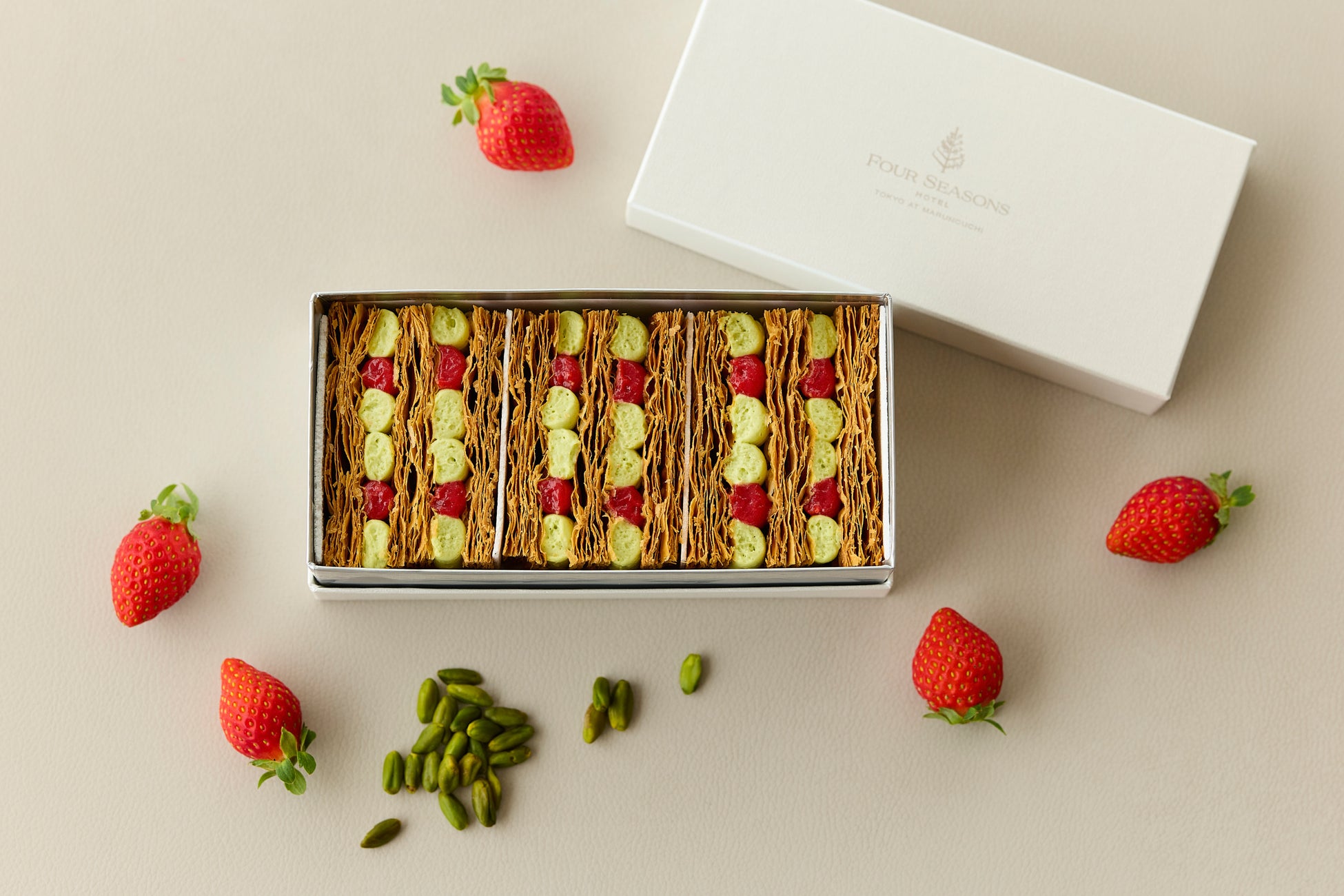 総料理長 ダニエル・カルバートのシグネチャーである、繊細な層が幾重にも重なるパイ生地が人気のミルフィーユ。1月16日(木)からの季節のミルフィーユは、苺とピスタチオのミルフィーユ。サクサクのパイ生地に、濃厚なピスタチオクリームに苺のコンポートを挟んでいます。メレンゲとピスタチオパウダー、ラスベリークリスピーをトッピングして仕上げています。クラシックなスタイルをお楽しみください。