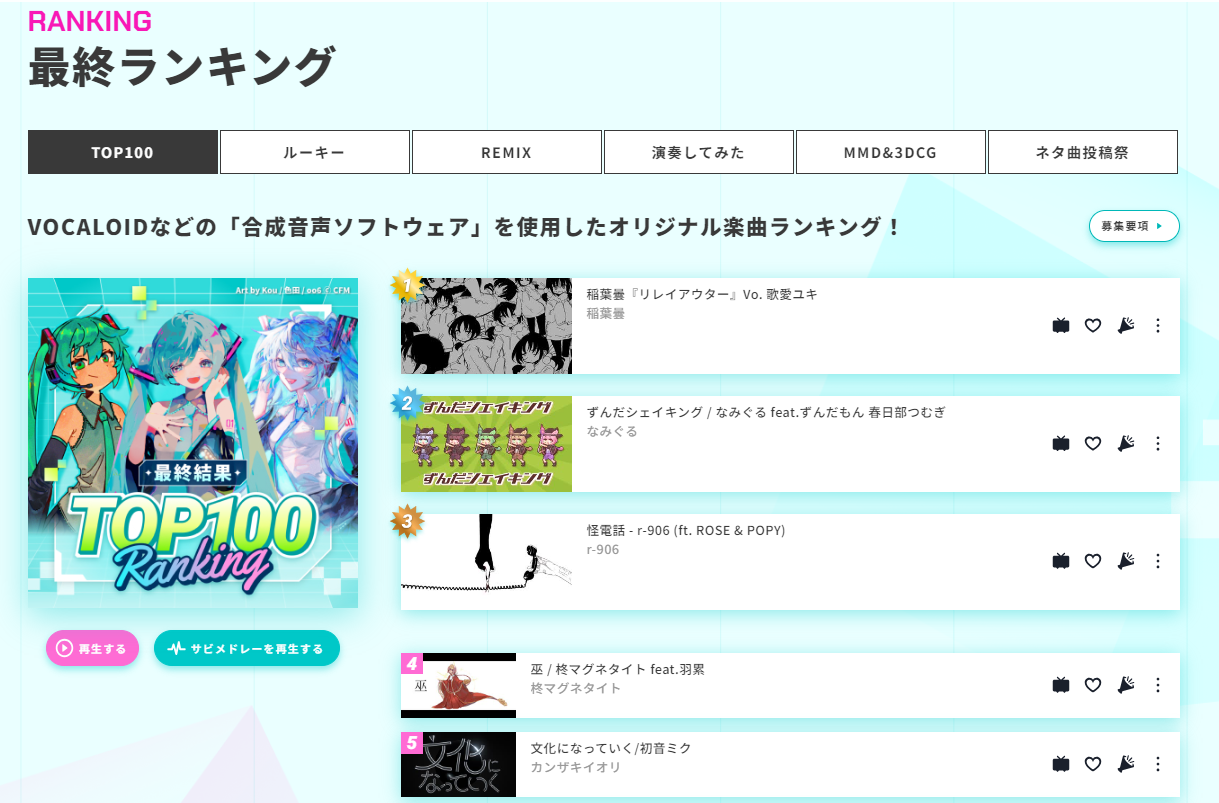 今回、約6,600件の投稿数を記録した「ボカコレランキング」では、人気ボカロPや様々なジャンルのクリエイターが一斉にボカロ動画作品を制作・投稿し、各種カテゴリでランキング順位を競い合いました。また、この作品投稿数のうち、デビュー2年以内のボカロPを対象としたルーキーランキングも過去最高となる約3,780件を記録。今回もクリエイターとユーザーの間で大きな盛り上がりを見せ、ボカロづくしの4日間となりました。また、上位にランクインしたほかの楽曲も、各メディアパートナーの番組内でオンエアされるほか、クリエイターのゲスト出演や番組テーマソングへの採用などの特別企画も予定されています。