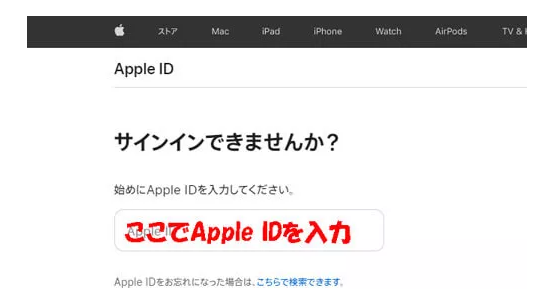 Step1. Appleの公式ホームページから「Apple ID管理ページ」へ進み、「Apple IDまたはパスワードをお忘れですか?」へアクセスします。