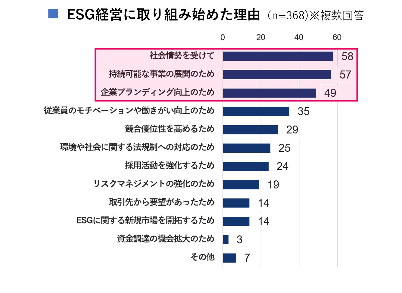 また、ESG経営に「取り組んでいる」と回答した経営者に、ESG経営に取り組み始めた理由についても聞いた。「社会情勢を受けて」が最も多く 、次いで、「持続可能な事業の展開のため」、「企業ブランディング向上のため」と続いた。