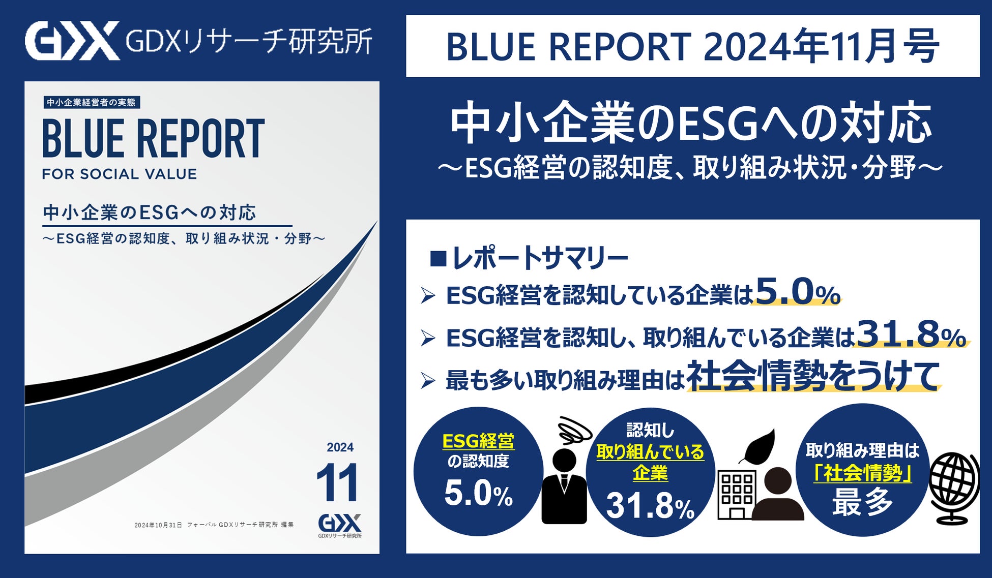『「新しいあたりまえ」で、新しい世界を創るFORVAL』を理念に掲げる、次世代経営コンサルタント集団である株式会社フォーバル(本社:東京都渋谷区、代表取締役社長:中島 將典、以下「フォーバル」)が運営するフォーバル GDXリサーチ研究所は、中小企業のESGへの対応について調査した「BLUE REPORT 11月号」を2024年10月31日(木)に発行しました。