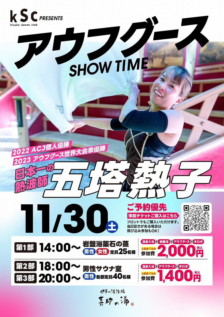 11月30日(土)伊予の湯治場 喜助の湯(愛媛県松山市)にて日本一の熱波師「五塔熱子」のよるアウフグースイベントを開催します。参加には、前売り券購入が必要です。店舗フロントにて11月15日より前売り券販売を開始します。また、先行してWEBにて購入していただける電子チケット(ニフティ温泉電子チケット)は現在販売中です。