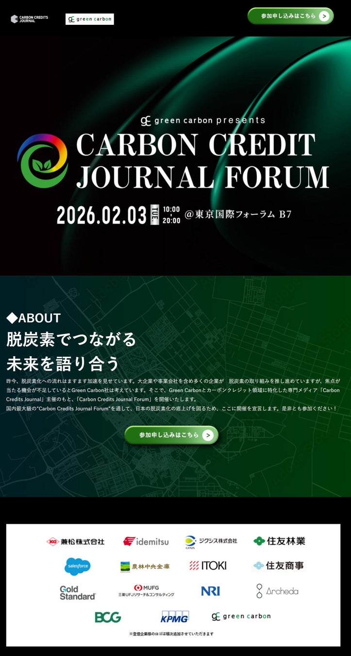 ネイチャーベースのカーボンクレジット創出・販売事業を展開するGreen Carbon株式会社(代表取締役:大北潤、以下Green Carbon(グリーンカーボン))はこの度、国内最大級のカーボンクレジット特化フォーラム「Carbon Credits Journal Forum(以下、本Forum)」を、2026年2月3日(火)に東京国際フォーラムB7(有楽町駅直結)にて開催することをお知らせします。