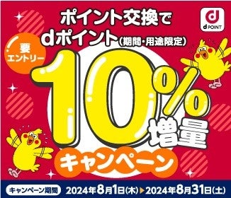 ■概要: キャンペーンサイトからエントリーの上、キャンペーン期間中に対象のポイント交換企業が提供するポイントをdポイントへ交換すると、交換されたdポイントの10%分をもれなくdポイント(期間・用途限定)として増量して進呈いたします。