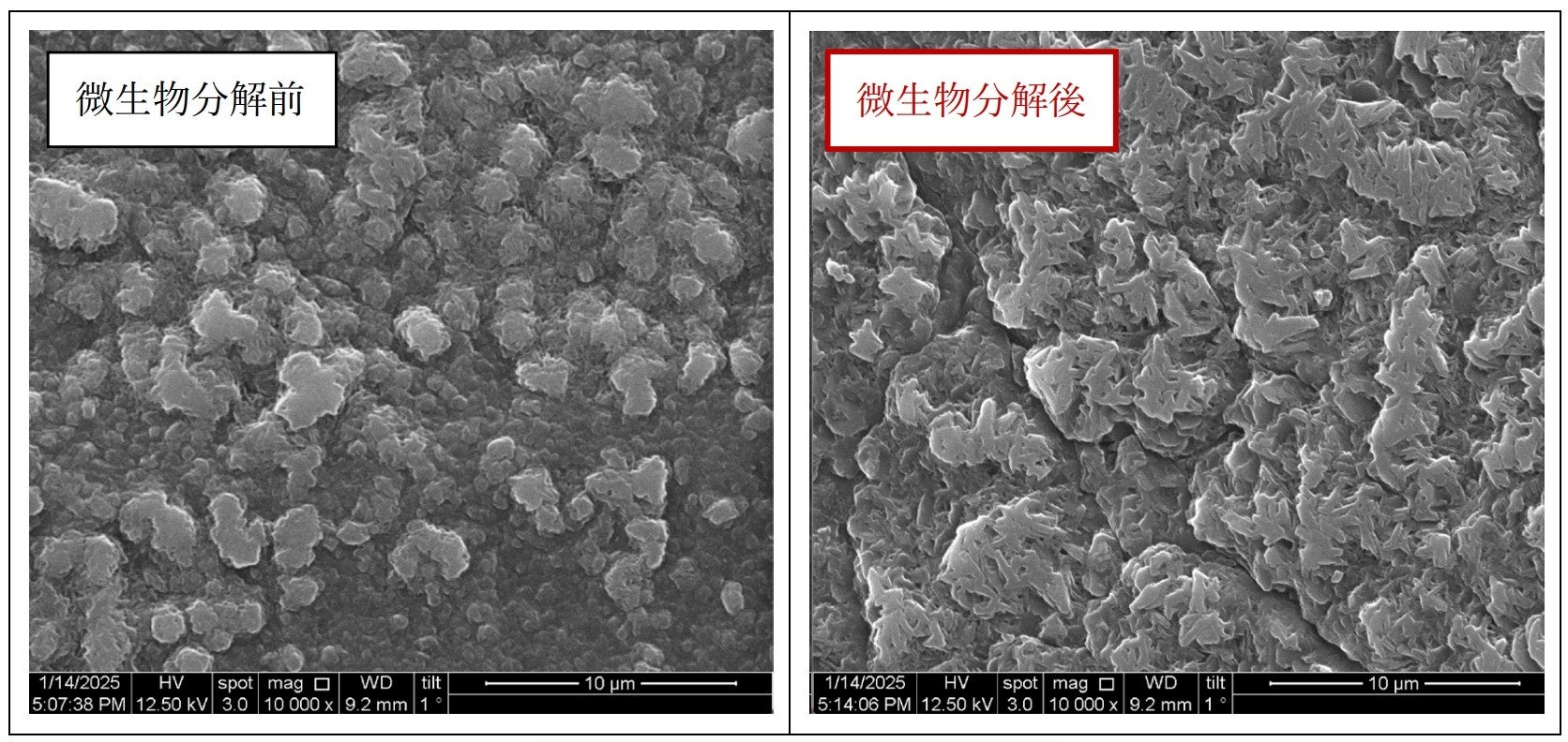 → 分解菌をPUフィルムに作用させたところ、明確な分解痕を確認した。