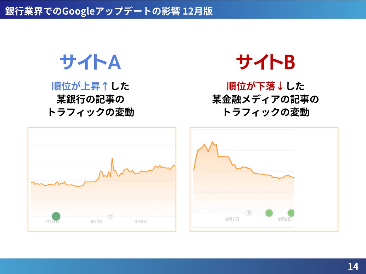 今回のアップデートは、特に銀行業界において顕著な影響をもたらしました。金融関連の検索キーワードは、多くのユーザーにとって重要な情報源であり、サイトの順位変動が業界全体のトラフィックに大きな影響を与えています。