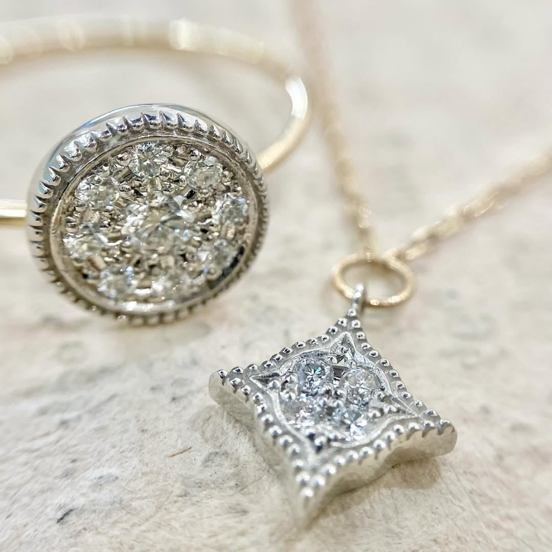 「ミルグレイン」は、小さな世界の中にふたつの伝統技法を込めた、やわらかな輝きが特徴のジュエリーです。ダイヤモンドは一石ずつ丁寧に彫り留めを施し、縁を飾るミルは糸で一粒ずつ磨き上げることで、手仕事ならではの繊細な表情を生み出しております。