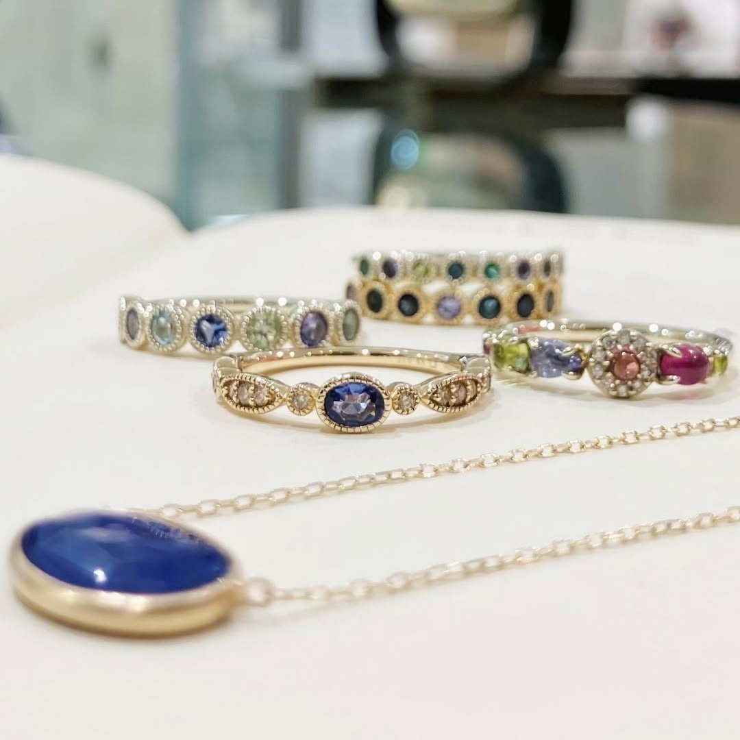 店頭には、リング・ペンダント・ピアスなど多彩なアイテムをご用意しております。誕生石が持つ豊かな青の世界をご覧ください。