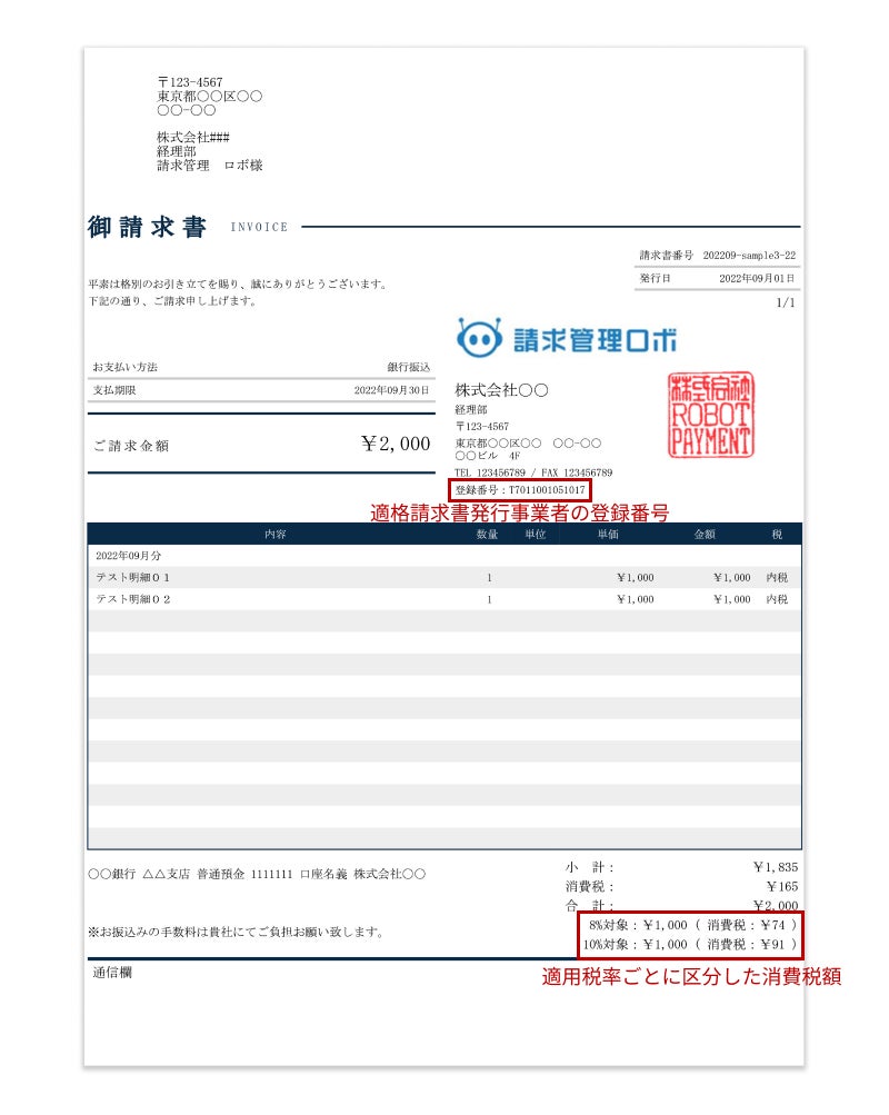 インボイス制度において表記が必要となる「適用税率」と「消費税額」の情報が、請求管理ロボで発行される請求書に記載されるようになります。