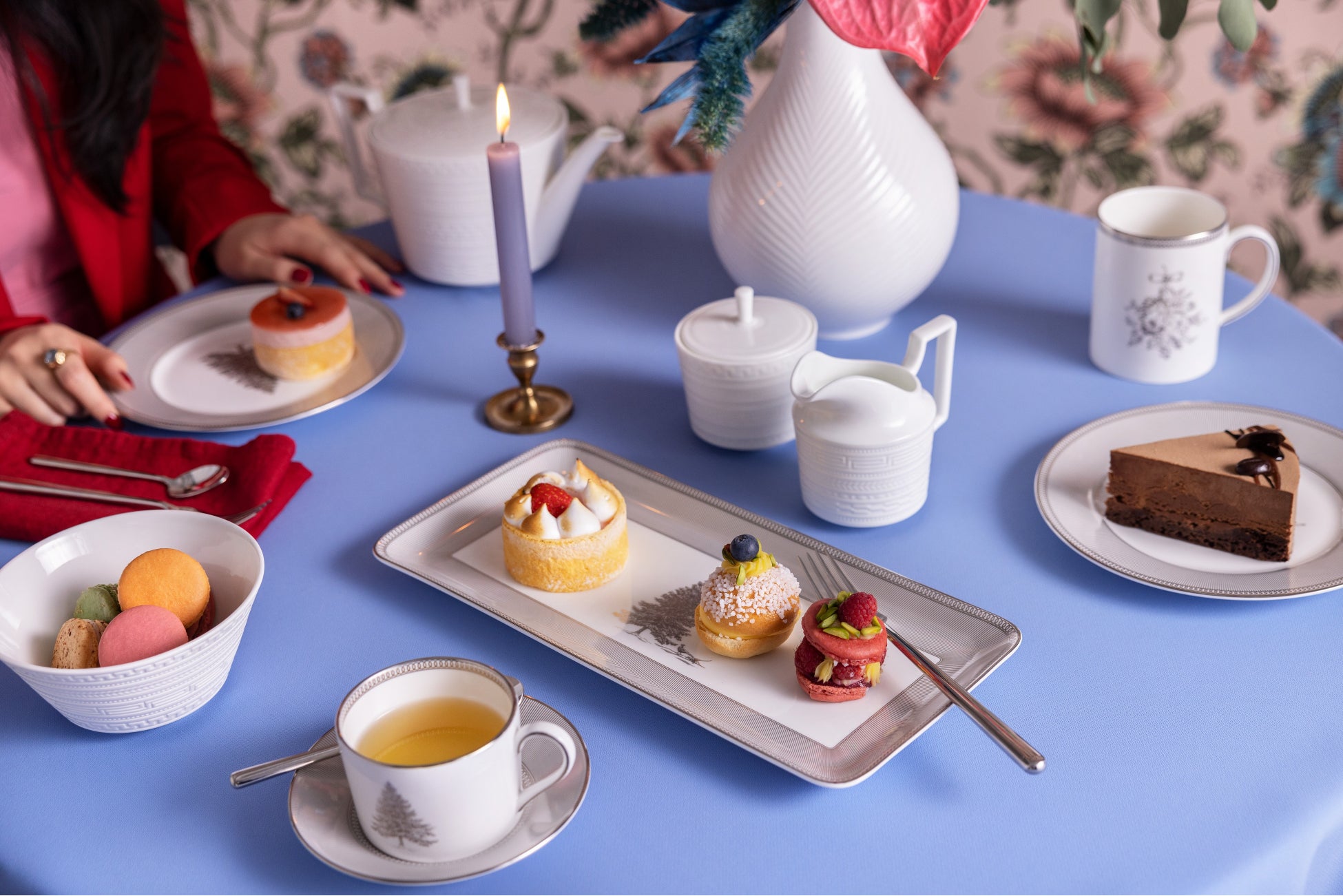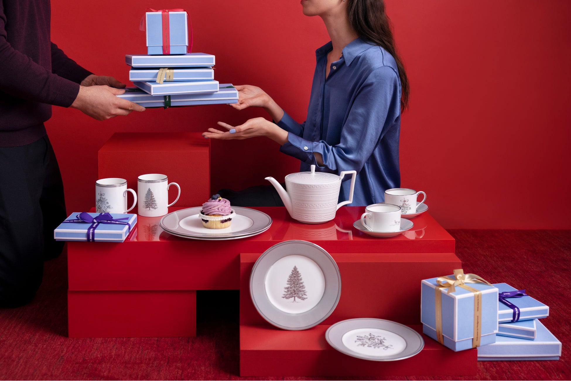 冬のムードを盛り上げるのは、精緻なプラチナ彩で描かれたヒイラギとツリーの2つのモチーフ。光沢を控えたマットな質感のプラチナ彩が優しく輝き、お料理と食卓を上品に飾ります。お手持ちの食器にアクセントで加えて、ティータイムやおもてなしディナーなど、季節のテーブルコーディネイトをお楽しみください。