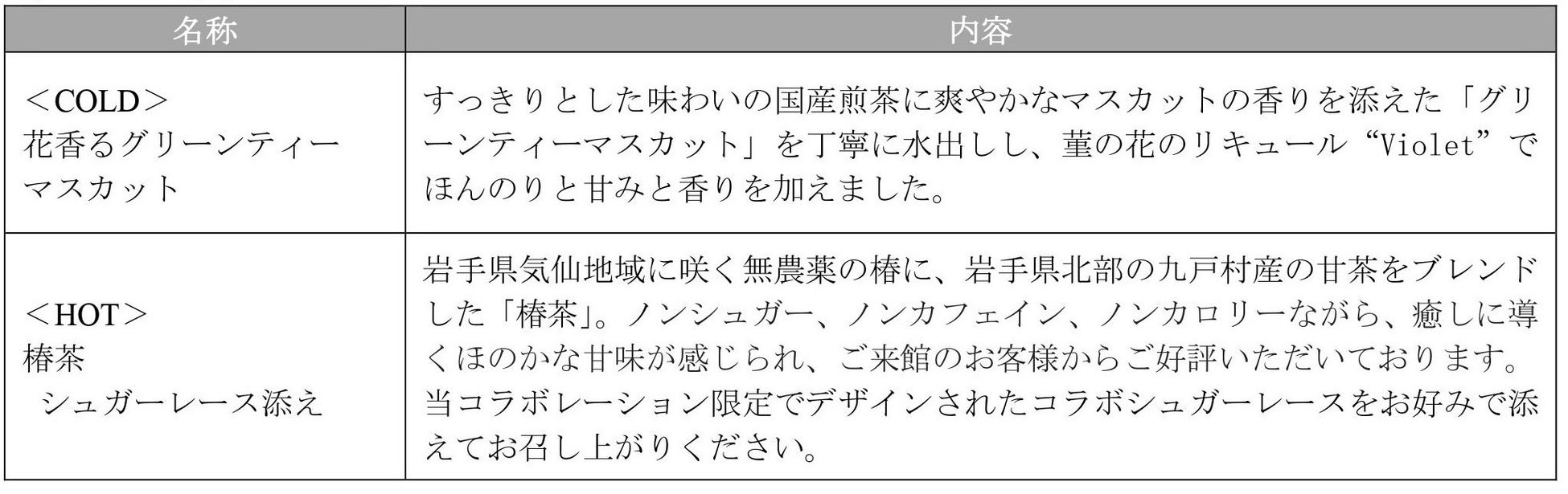 また、スイーツに合わせたコールドとホットドリンク2種を提供いたします。コールドドリンクはすっきりとした味わいの国産煎茶に爽やかなマスカットの香りを添えた「グリーンティーマスカット」を丁寧に水出しし、菫の花のリキュールでほんのりと甘みと香りを加えた「花香るグリーンティーマスカット」を、ホットドリンクにはホテルオリジナルの「椿茶」をご用意いたします。椿茶は、今回のコラボレーションの為に特別に作られたコラボシュガーレースをお好みで添えてお召し上がりください。