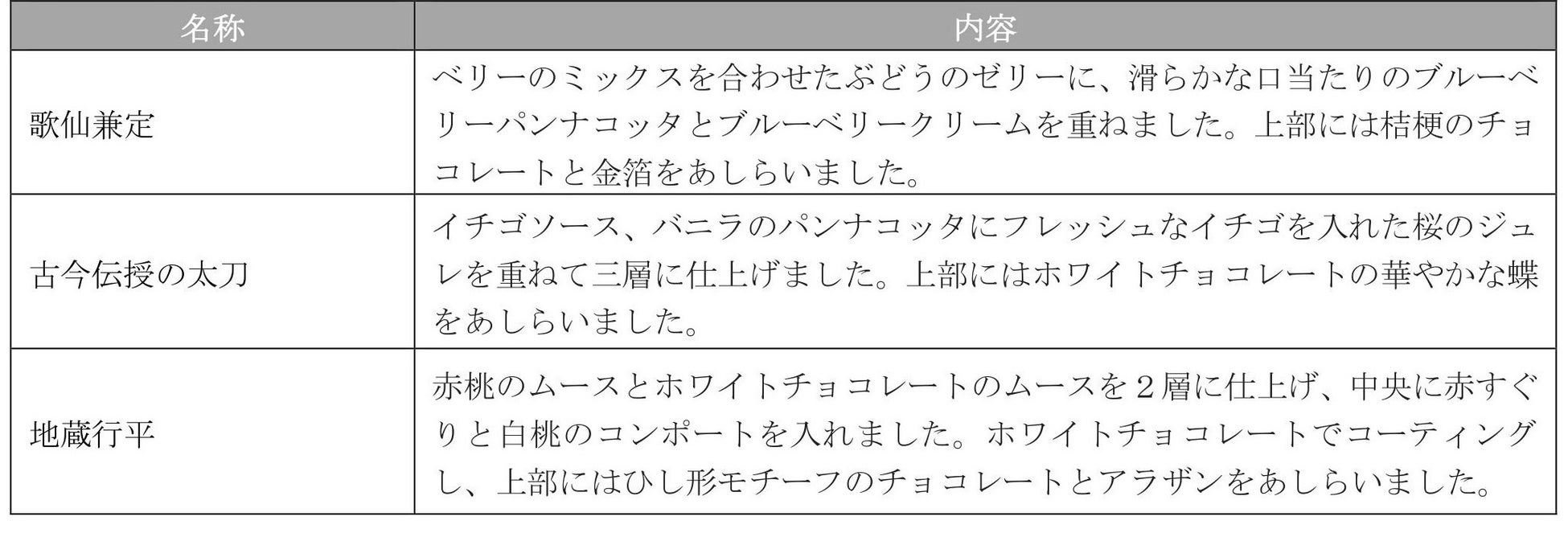 スイーツは、刀剣乱舞ONLINEのキャラクター「歌仙兼定」、「古今伝授の太刀」、「地蔵行平」の3振りの刀剣男士を、それぞれホテル椿山荘東京のパティシエが表現しました。「歌仙兼定」はベリ―のミックスをあわせたぶどうのゼリーにブルーベリーのパンナコッタとクリームを重ねました。「古今伝授の太刀」はイチゴソース、パンナコッタにフレッシュなイチゴを入れた桜ジュレを重ね、三層に仕上げています。「地蔵行平」は中央に赤すぐりと白桃のコンポートを入れた赤桃のムースとホワイトチョコレートのムースを2層に仕上げ、ホワイトチョコレートでコーティングしました。上部にはそれぞれのキャラクターのモチーフをあしらい、世界観を感じながら味わっていただけます。
