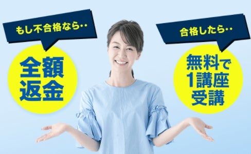 万が一不合格だった場合の「受講料全額返金保証」や、合格すれば100を超える人気講座の中からお好きな講座を“無料”で受講できる「2講座目無料サービス」など、キャリカレ独自のサポート・サービスも付属!充実のサポート・サービスで安心して学習できます。
