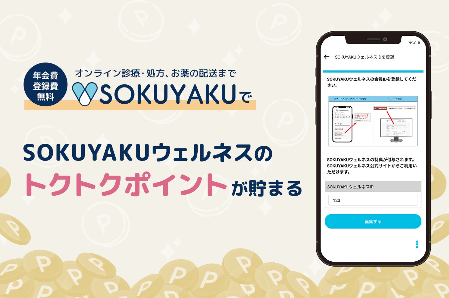 この度の連携により、2025年4月28日(月)から、「オンライン診療アプリ「SOKUYAKU(ソクヤク)」のアカウント設定にて、SOKUYAKUウェルネス会員番号を登録することで、会員登録時やオンライン診療・服薬指導の利用時に「トクトクポイント」が貯まるようになります。