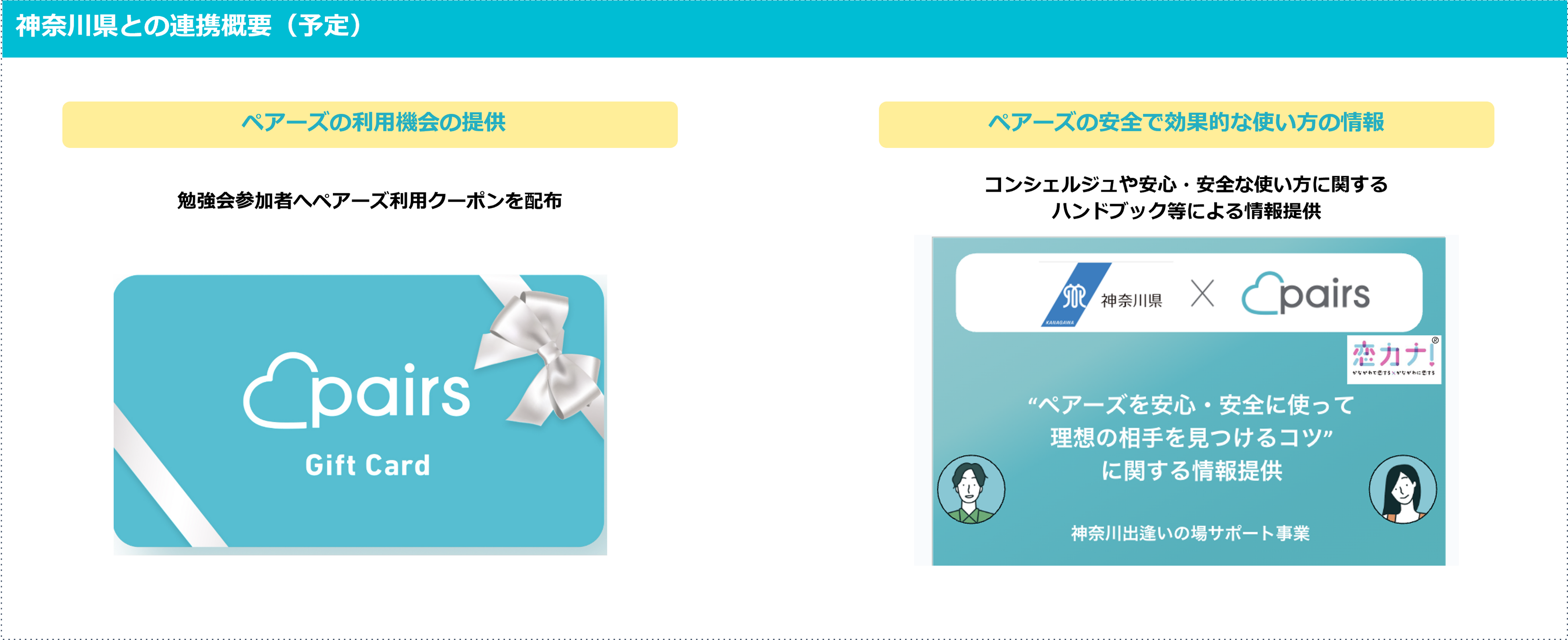 神奈川県では、安心して子どもを産み育てることができる社会の実現を目指し、結婚・妊娠・出産・育児の切れ目ない支援の一つとして、結婚支援事業「恋カナ!プロジェクト」を実施しています。県内市町村や企業・団体と連携した婚活イベントに加え、マッチングアプリの適正利用を促すため、ペアーズを含むマッチングアプリ運営会社6社と連携協定を締結しました。