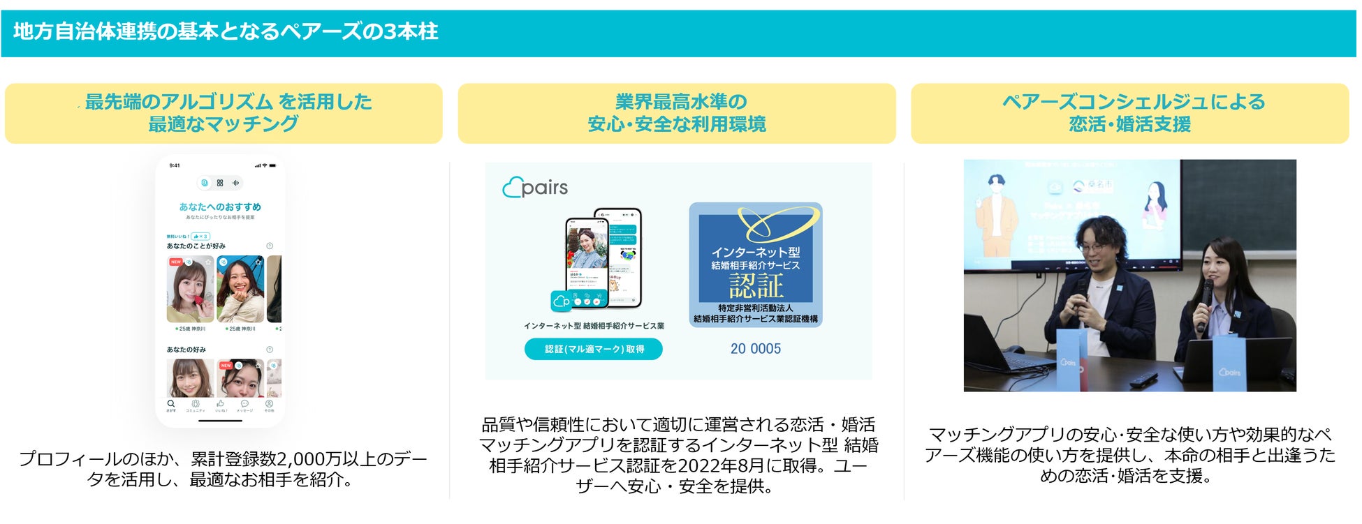 ペアーズは、地方自治体の特性や課題にあわせて支援する連携の実施や、外部関係者や有識者と協働した共同調査の実施や白書の制作・政策言の実施を通じて、より多くの「出逢い」を生むための活動を行ってまいりました。またマッチングアプリが出逢いの形として定着しつつある中、地方自治体への出逢い支援として、これまで2022年11月に三重県桑名市、2023年6月に岐阜県の3市(関市・美濃加茂市・各務原市)、および同県の海津市、9月に宮崎県宮崎市、10月に北海道室蘭市との連携協定を締結しています。