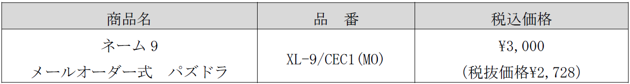 「ネーム9 メールオーダー式 パズドラ」は、ご購入していただいた商品到着後に、印面をパソコン(Web)や携帯電話・スマートフォン(Web)から申し込むメールオーダー式です。商品発送は11月以降の予定となります。
