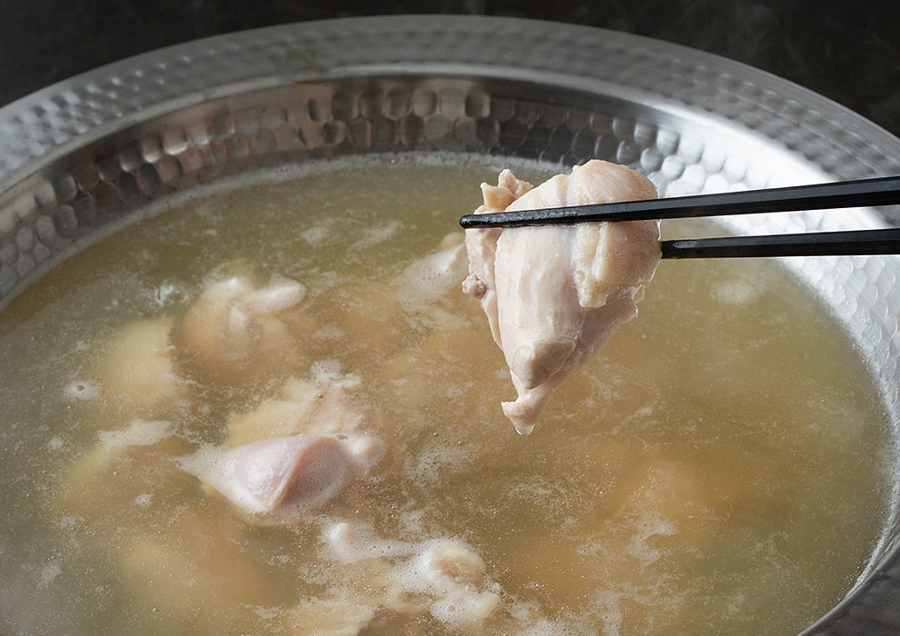「美桜鶏」という美しい桜色の繊細な肉質の鶏肉です。普段、水炊きはぽん酢で食べることが多いと思いますが、この鍋はぜひ藻塩だけで味わってください。鶏肉を調理することにより、スープの中で感じる鶏肉の旨味がまた一段とはっきりします。ぜひその変化を味わってみてください。