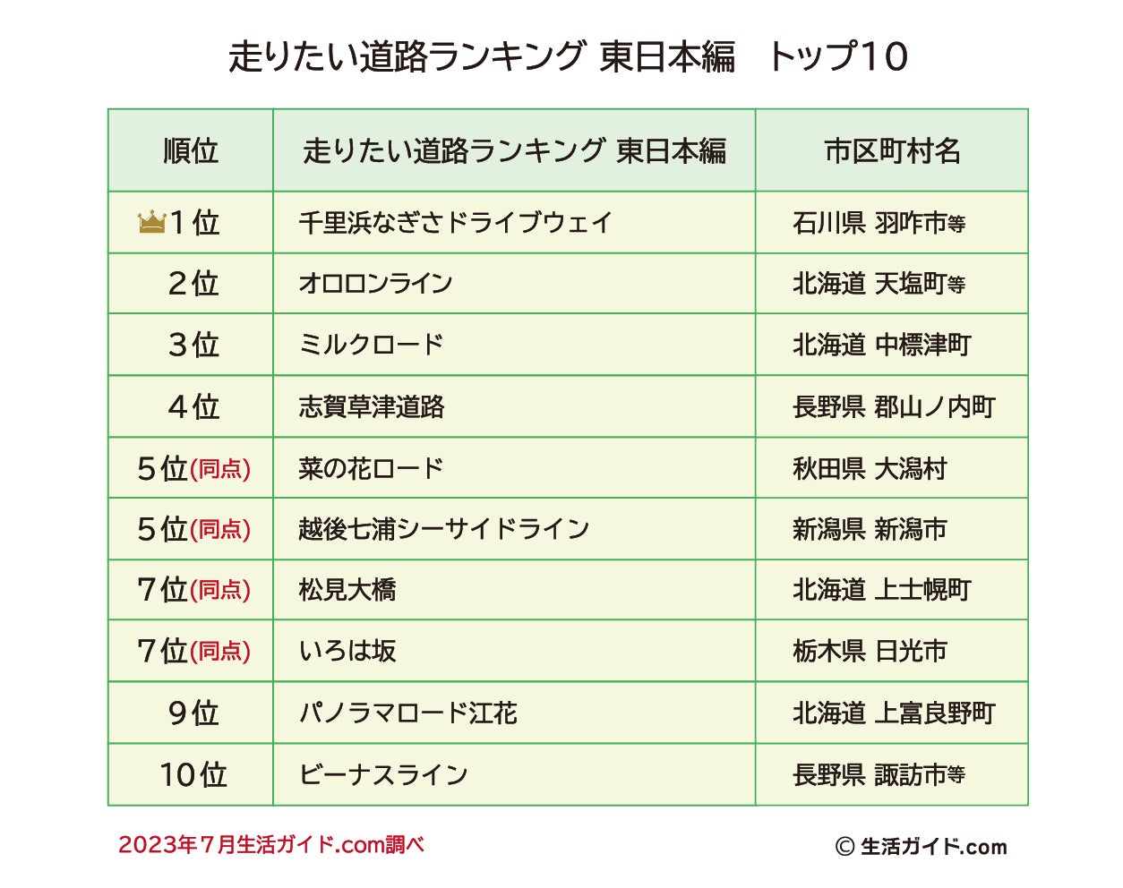 このランキングは、見た目が美しい、見晴らしがとてもいいと感じる、東日本にある素敵な道路を生活ガイド.com運営事務局が厳選し、「思わず走りたくなるような道路」として生活ガイド.com会員に投票してもらいました。そんな車やバイク・自転車・ジョギングで走ってみたいと思う「道路」のランキングの結果は以下の通りとなっております。