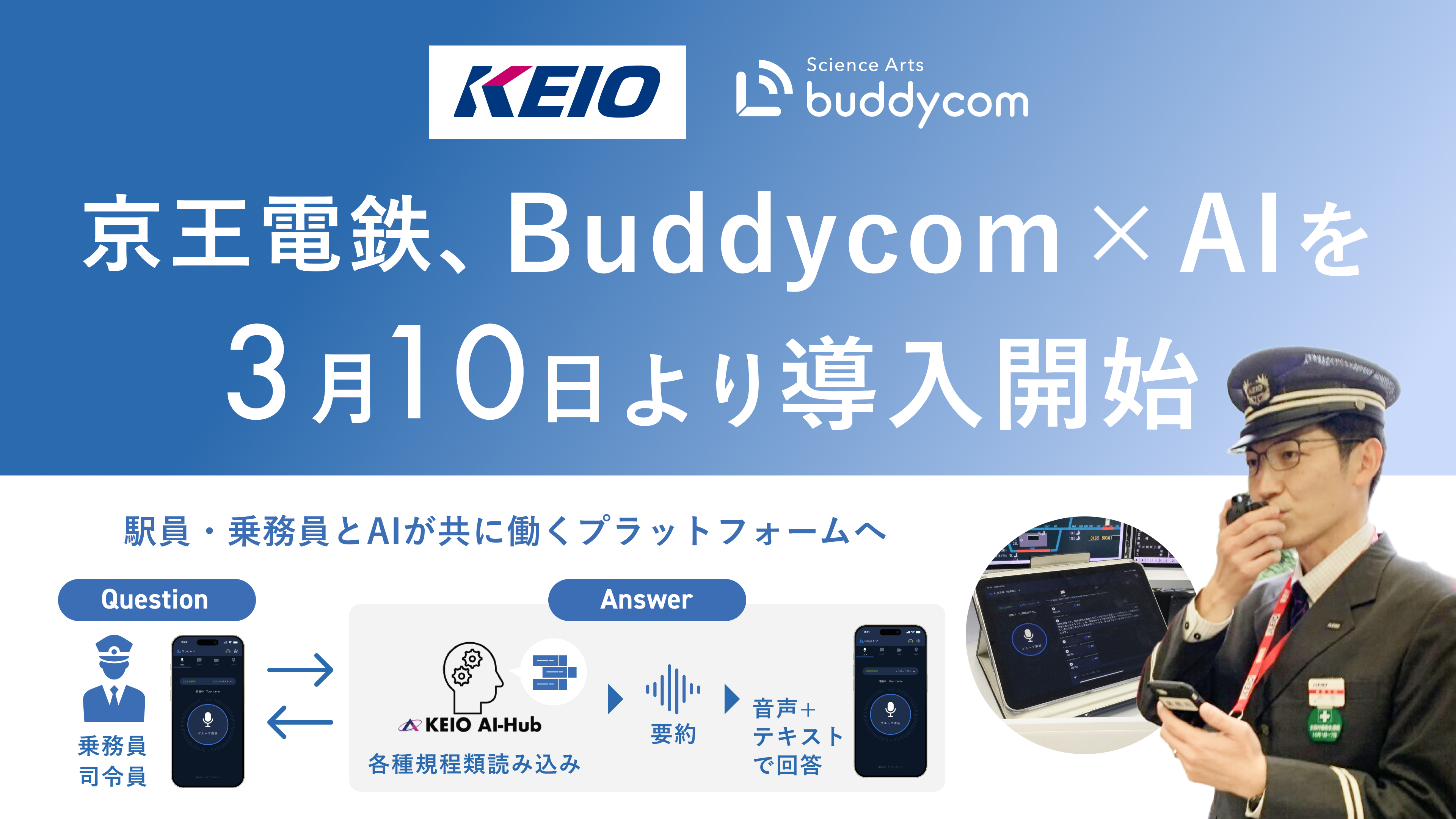 株式会社サイエンスアーツ(所在地:東京都渋谷区、代表取締役社長:平岡 竜太朗)は、フロントラインワーカーをつなげるライブコミュニケーションプラットフォーム「Buddycom(バディコム)」と社内マニュアルを学習させたAIと連携した初の事例として、京王電鉄株式会社(本社:東京都多摩市、代表取締役社長:都村 智史)にて、3月10日(火)より運用開始することをお知らせいたします。