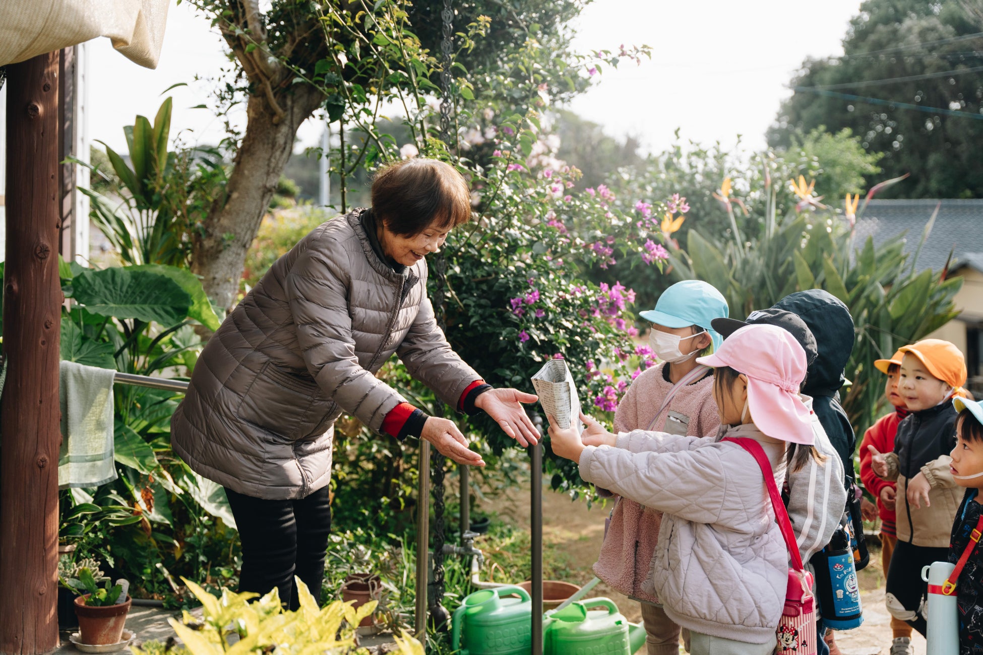 「海や山や土手の草むらで五感を使いたっぷりと遊べる大自然が近くにあるところが魅力です。ムベ、アケビ、エビヅルなど四季の恵みを手摘みで味わえるのもここならでは。そして、たくさんの島の人が活動に関わってくれているところも自慢です。私たちは子どもを中心とした生活を軸としており、園のルールも子どもたち主導でつくっています。少人数だからこそできる「個を守る」保育環境が整っていると思いますので、ぜひ安心してお越しください。島の自然や歴史、離島ならではの不便さ、地域の人との深いつながり、どれもが他では味わえない魅力的なものだと思います。」