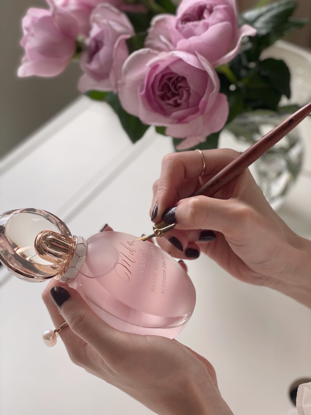「ローズ ゴルデア ブロッサム ディライト」製品をご購入のお客様に、お名前やお好きなメッセージを現品フラコンに、カリグラファーアーティスト岩倉桃代さんがペイントいたします。
