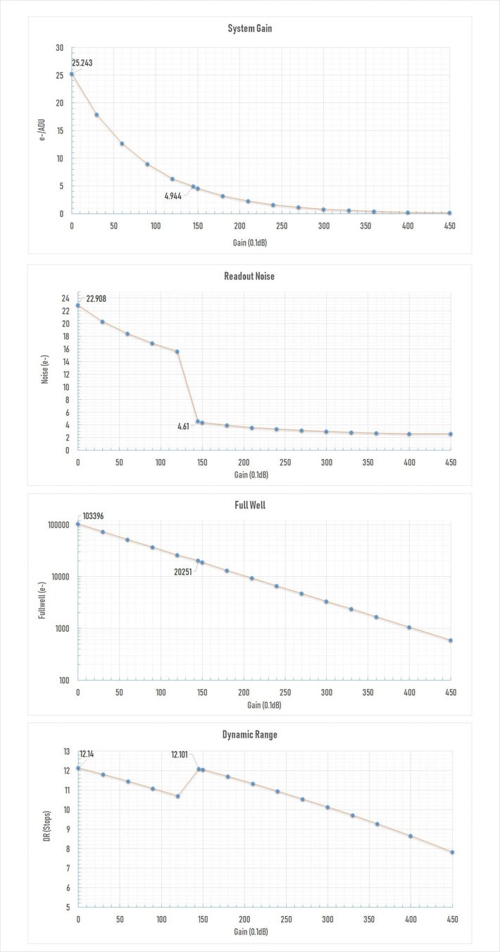 ・ゲインが145以上になると自動的にHCG(ハイコンバージョンゲイン)モードに切り替わり、最小2.6e-まで読み出しノイズを抑えます。
