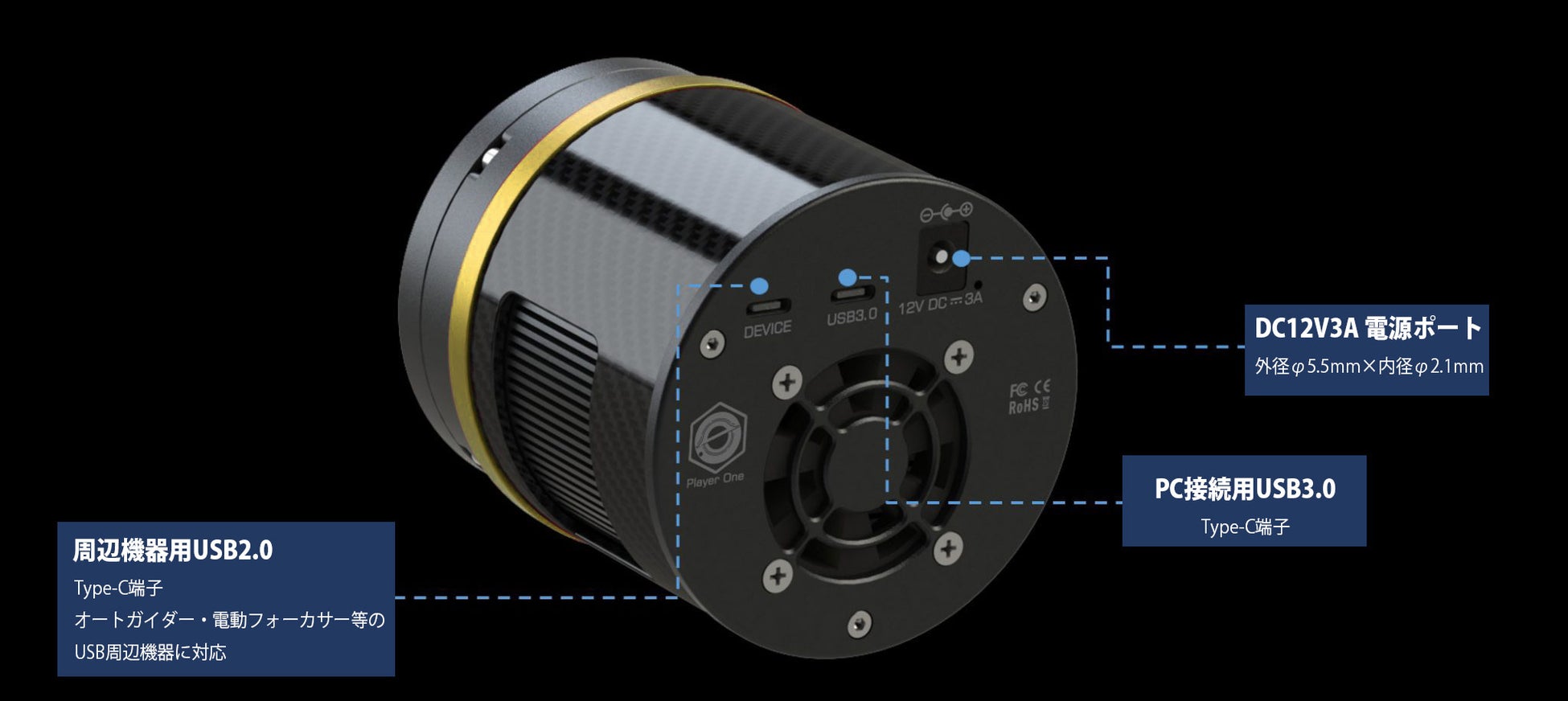 ・カメラとパソコンの接続にはUSB-AやUSB-Bより先進的な規格であるUSB3.0 Type-Cを使用します。USB Type-Cにはコネクターの裏表の区別がなく、迅速で確実な接続が可能です。オートガイダーなどのアクセサリー用のポートも用意されており、接続にはUSB2.0 Type-Cを使用します。