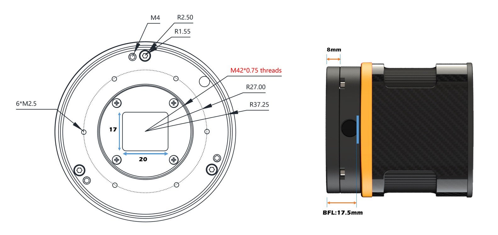 付属品:1.25″ノーズピース、キャップ(1.25“、M42)、USB3.0 Type-C to Aケーブル(2m)、USB2.0 Type-C to Cケーブル(0.5m)、USB2.0 Type-C to Bケーブル(0.5m)、4点チルトプレート、M42-M42 20mm延長筒、M42-M48 17.5mm延長筒、M42-M48 0mmステップアップリング、エアーブロワー、六角レンチ、ドライバー、M2.5ネジ×15、セミハードケース、ケーブルバンド