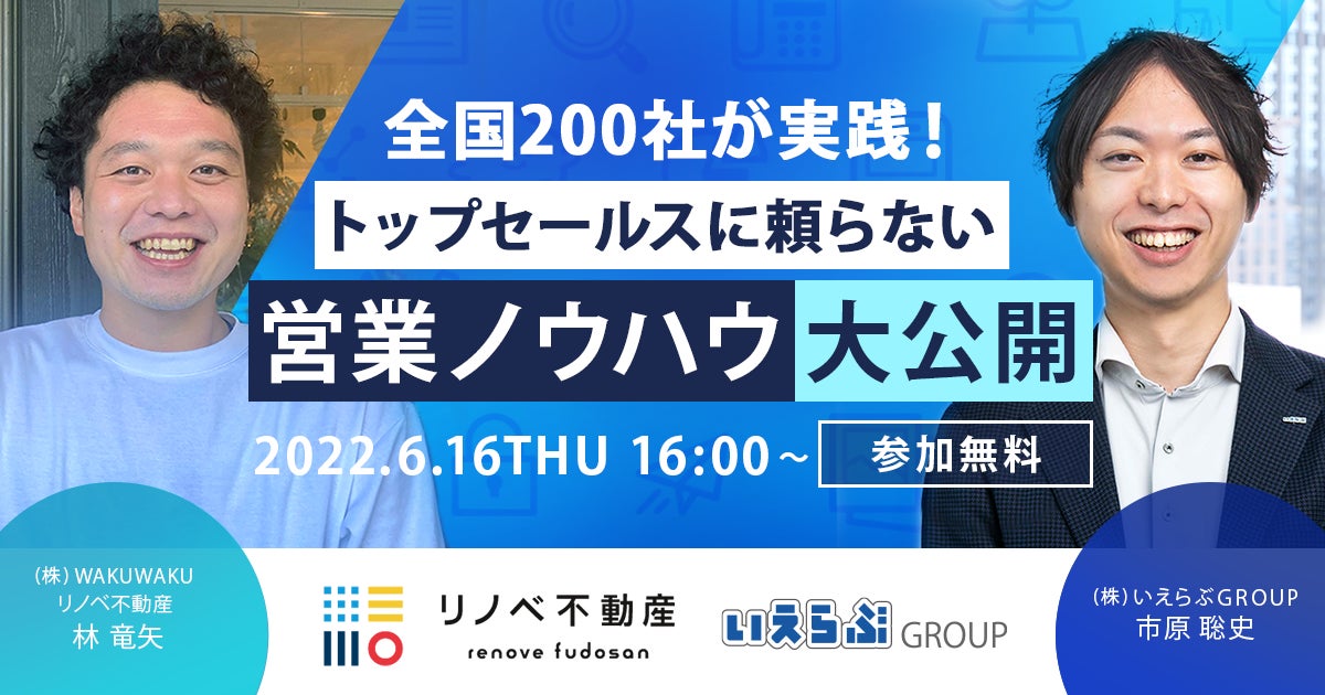 株式会社いえらぶGROUP(本社:東京都新宿区、代表:岩名泰介、以下「いえらぶGROUP」)は、2022年6月16日(木)、不動産売買仲介会社に向けた無料オンラインセミナーを開催、「不動産売買仲介における集客、成約率の向上」をテーマに、売上拡大を実現させるための営業戦略など、実践に基づくノウハウをお届けします。