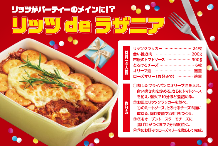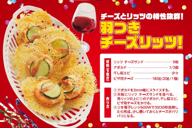 さらに「みんなで!リッツで!盛り上がれ!」をテーマに「リッツdeピッツァ!」を彩るパーティーメニューが勢揃い。トルティーヤチップスの代わりにリッツクラッカーを使った「リッツ de ナチョス」やラザニア生地を使わない「リッツ de ラザニア」、リッツチーズサンドとカリカリの羽根つきチーズのダブルチーズがたまらない「羽根つきチーズリッツ!」、そしてリッツチョコサンドとマスカルポーネチーズ、ミックスベリーを重ねて層を作るだけで出来上がる「パフェ風ミルフィーユ」と、おつまみからデザートまで、新発想のメニューが勢揃いです。