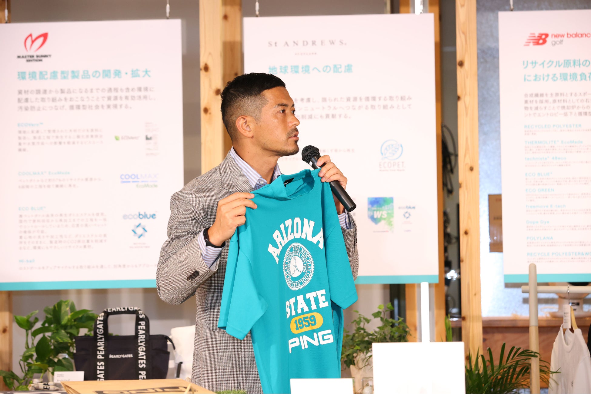 まず開催に至った経緯として、「ゴルフ業界では、ゴルフ場の開発に伴い80年代を中心に森林伐採が行われてきました。しかし近年、自然保護のため、伐採した1,2倍分の植林をするといった取り組みも推進されるなど、業界の意識も変化しています。そんな中、私たちアパレル企業もできることがあると考え、少しずつではありますがさまざまな活動に取り組んでいます。今日の展示もその一環として開催させていただきました」と、説明しました。