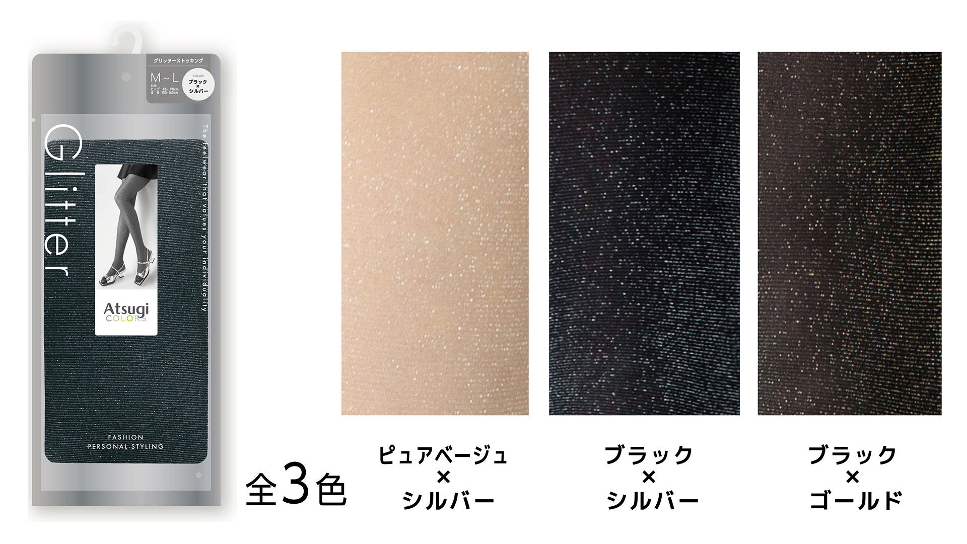 サイズ展開:タイツS~L、M~L、L~LL 、サスペンダーストッキングM~L、サイハイストッキング22~25㎝、ソックス22~25㎝、23~24㎝、グリッターストッキングM~L、L~LL