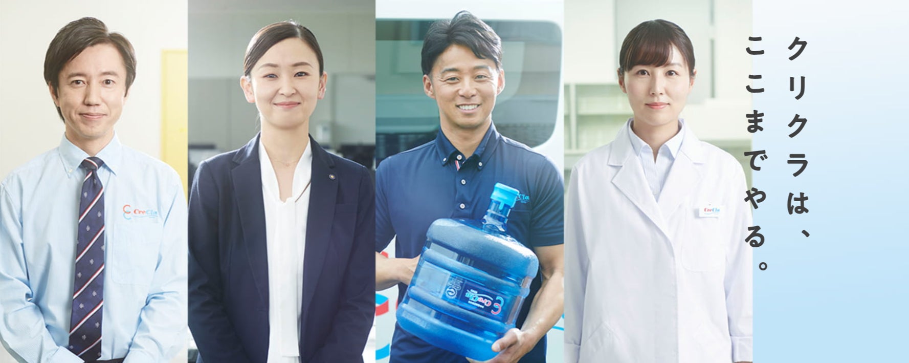 クリクラは、2002年の事業開始以来、「安心・安全」を理念に、現在約400拠点の配送ネットワークでご家庭やオフィスに直接製品を配送しています。環境に配慮したサステナブルなボトルの採用や輸送による CO2削減、サーバーの100%リサイクルなどの循環型社会を目指した取り組みを行うとともに、今後もクリクラに携わる研究員、メンテスタッフ、配送員などすべてのプロフェッショナルが協力し、お客様へ安心・安全なお水をお届けしてまいります。
