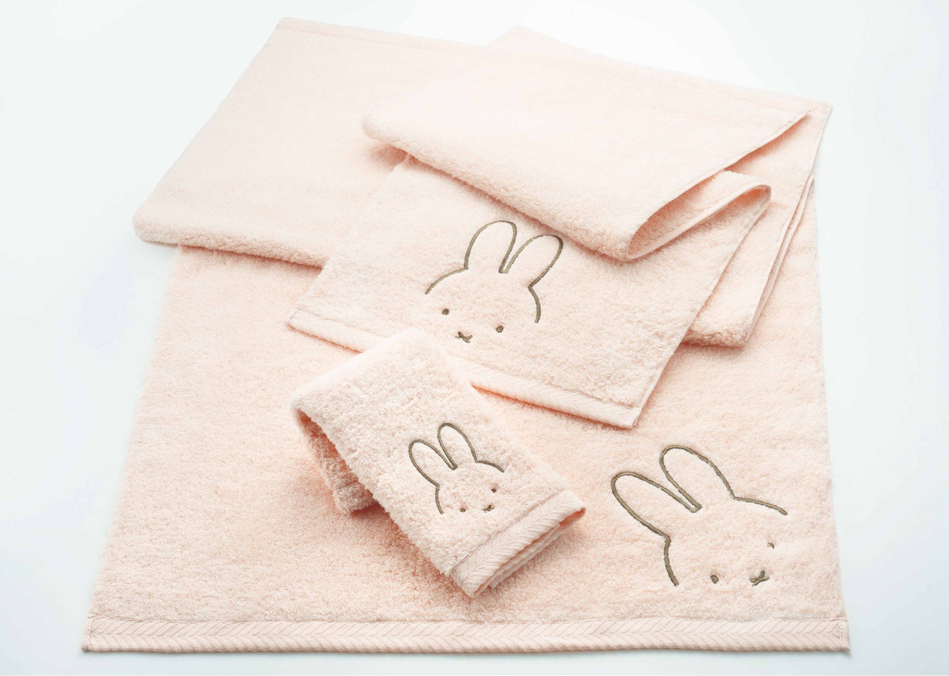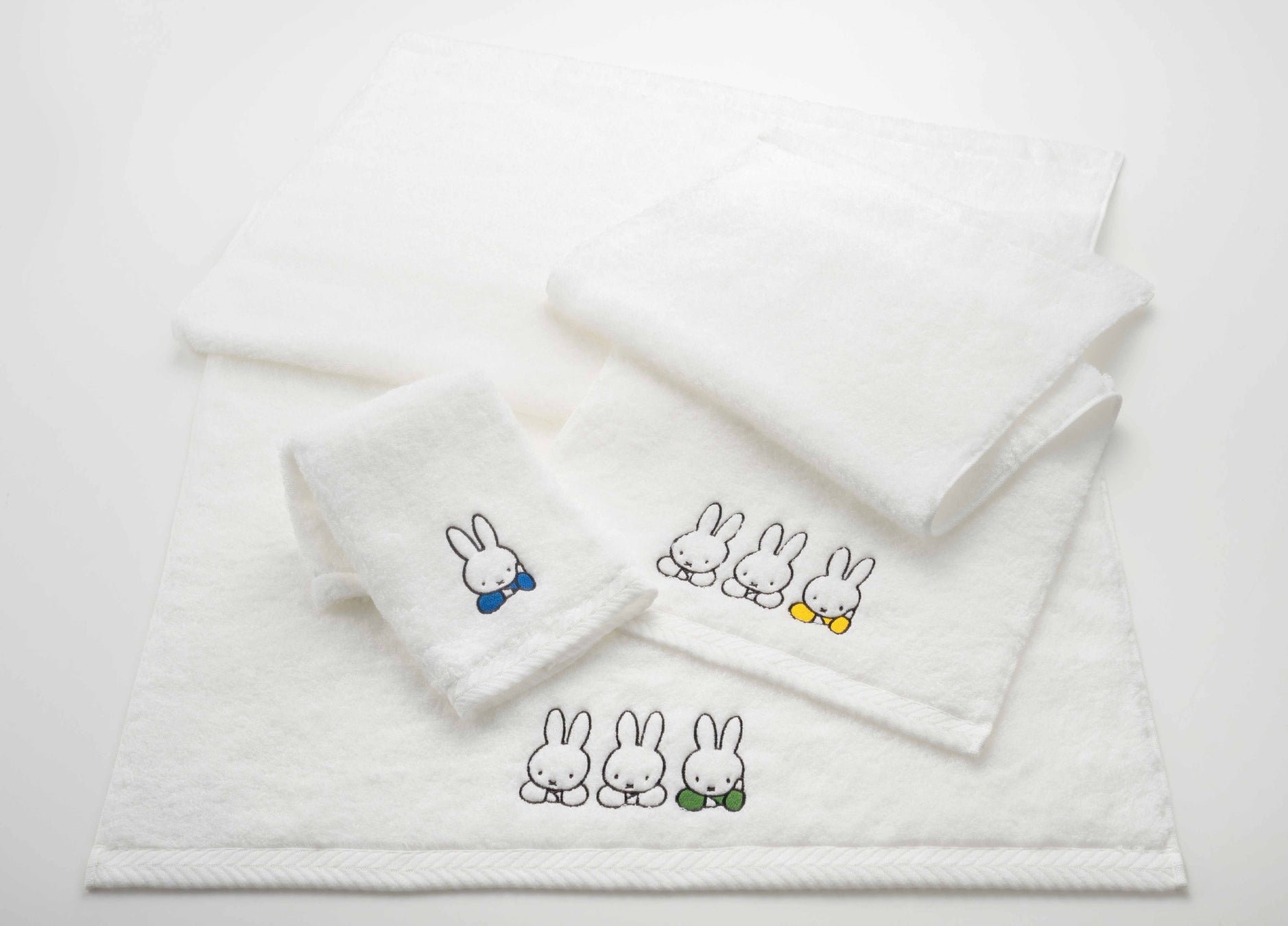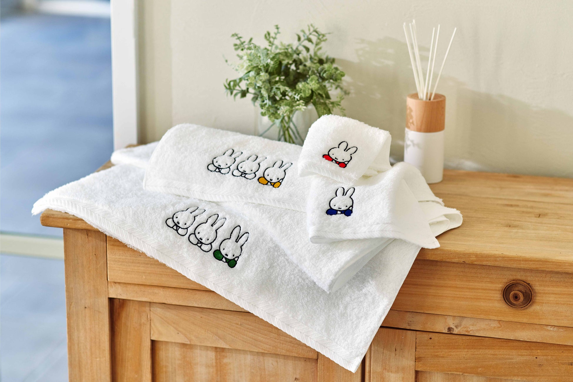 さらに、真っ白なタオルに頬杖をつく「ミッフィー」をポイントにした“ほおづえ”デザインも新登場。いずれも、ふんわりやわらかな「わたいろ」の素材感を生かしたシンプルなデザインなので、肌触りや品質にこだわりを持つ大人の女性におすすめです。各デザインで、バスタオル、フェイスタオル、ウォッシュタオル、ミニタオルの4種類を展開します。