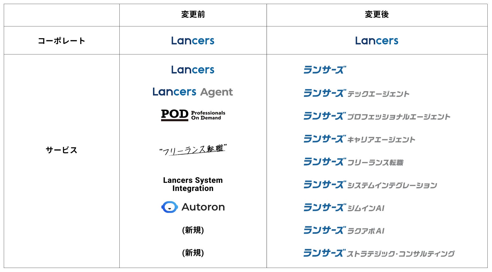 これまで事業単位で異なる名称で展開していたサービスを、すべて「ランサーズ」ブランドのもとに再編成いたします。企業向けサービス、個人向けサービス、AIソリューションなど各事業領域において、一貫性のあるブランド体験を提供してまいります。