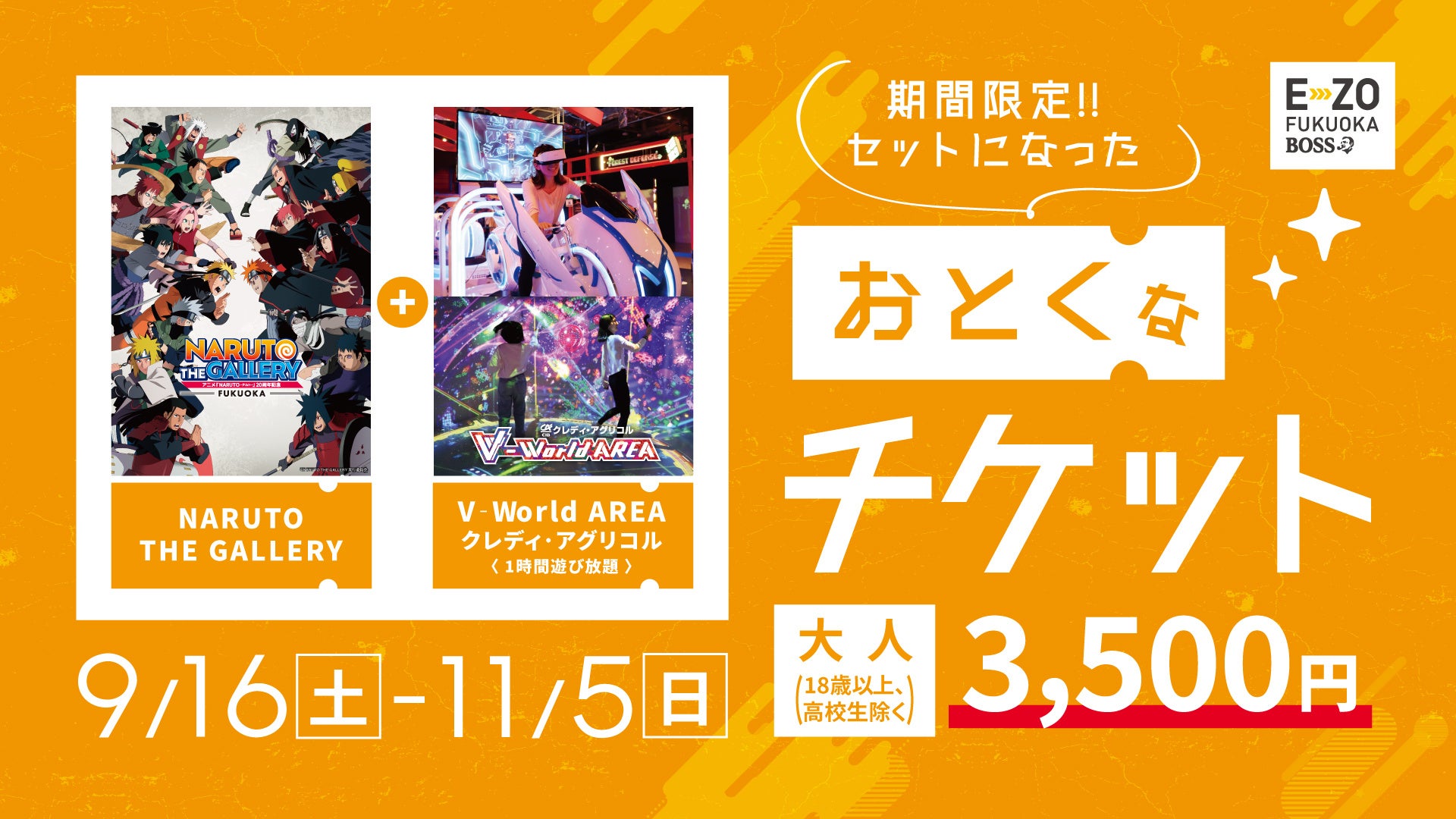 「NARUTO THE GALLERY FUKUOKA」の入場券と、多彩なバーチャルコンテンツが体験できる「V-World AREA クレディ・アグリコル」1時間遊び放題券がセットになったお得なチケットを販売!最大700円お得に!