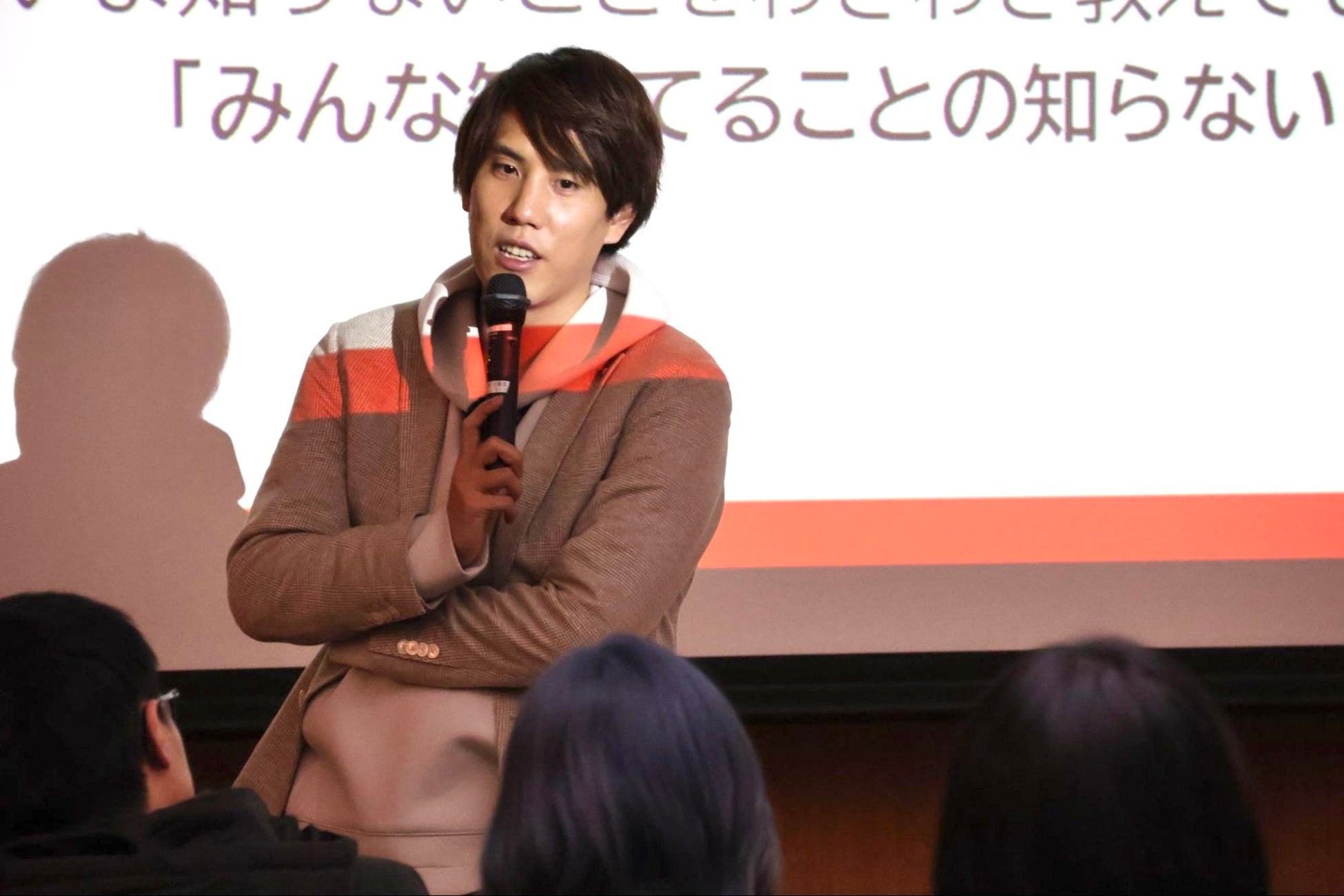 QuizKnockメンバーとしてYouTube動画やテレビ番組に出演する一方、国立科学博物館認定のサイエンスコミュニケーターとしても活動している須貝は、約30人の受講生に対して、サイエンスコミュニケーター自身がインフルエンサーとなって科学を発信していくことの有用性についてお話ししました。