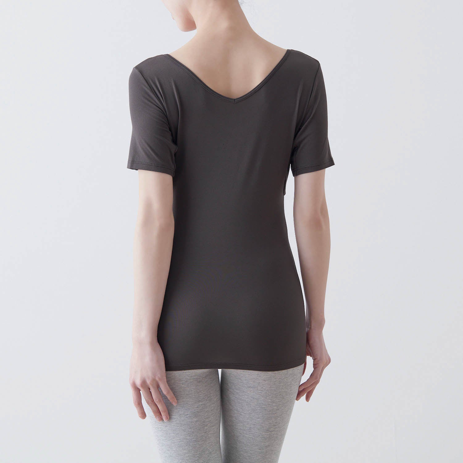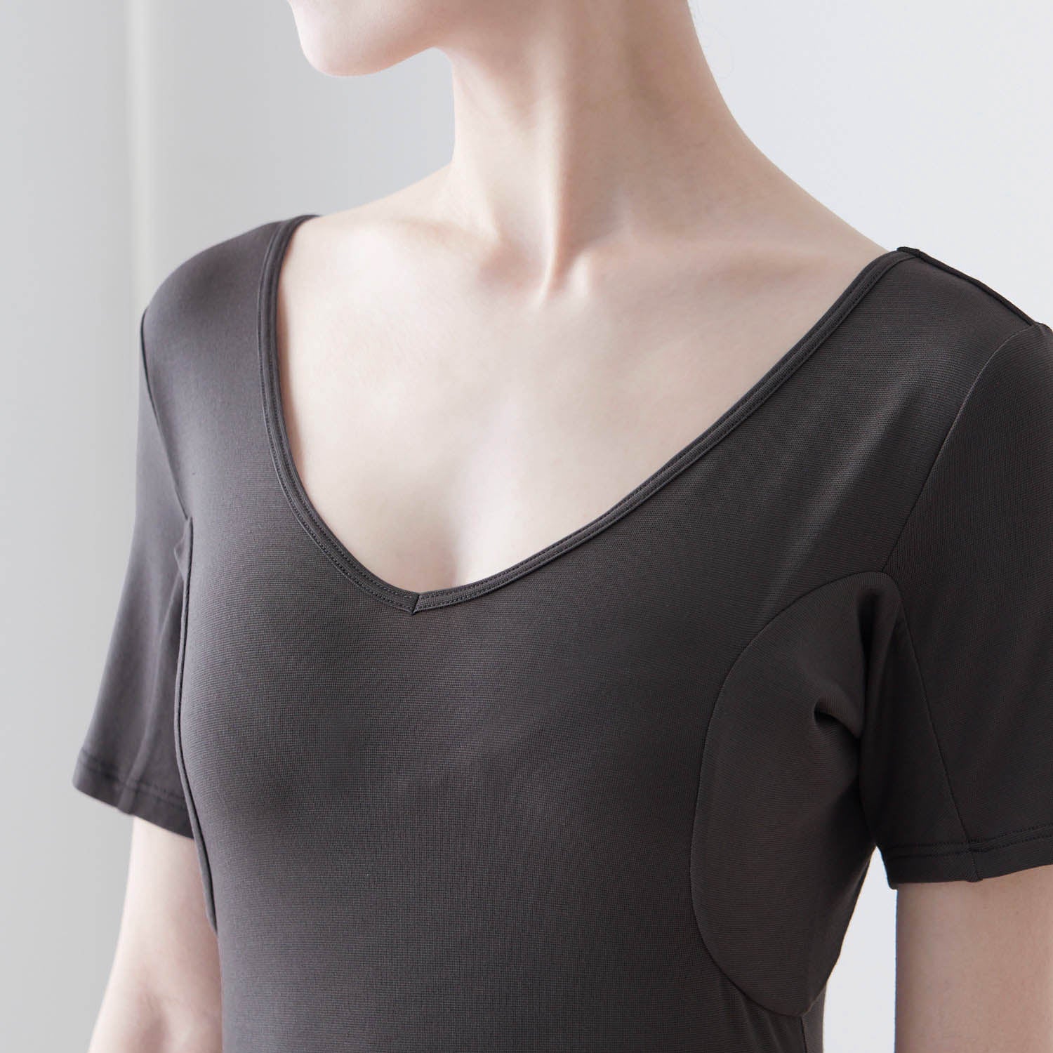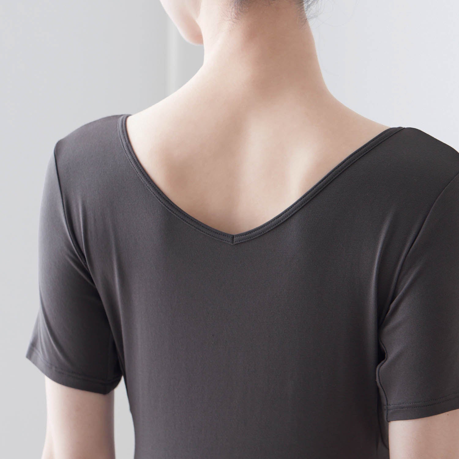 衿ぐりからのチラ見えの心配がない前後Vネックデザインの三分袖