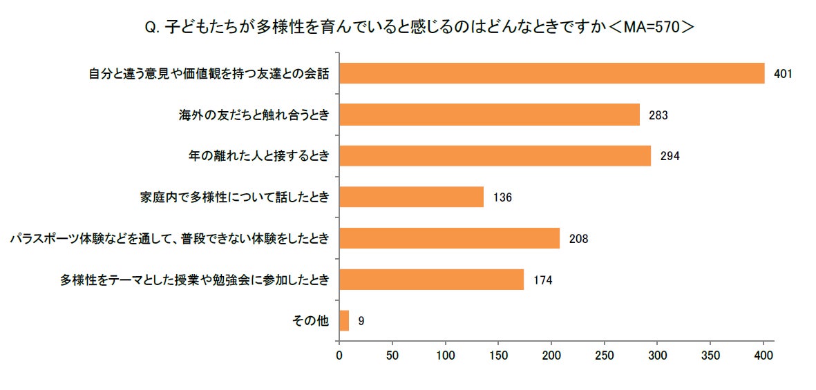 「子どもたちが多様性を育んでいると感じるのはどんなときですか<MA>」の問について、最も多い回答は「自分と違う意見や価値観を持つ友だちとの会話」(401)で約8割となりました。さらに、「年の離れた人と接するとき」(294)や「海外の友だちと触れ合うとき」(283)も約半数と多く、普段の人とのコミュニケーションの中で多様性を育んでいることが分かりました。また、子どもの多様性を育む機会を今後も増やしていきたいと考える親は全体の9割以上となり、ほとんどの親が多様性を育むことが重要だと考えていることが伺えます。