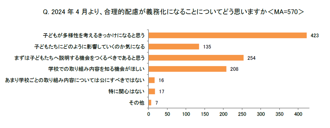 また、「2024年4月より、合理的配慮が義務化になることについてどう思いますか<MA>」という問では、「子どもが多様性を考えるきっかけになると思う」(423)との回答が7割以上と最も多く、子どもへのポジティブな影響を期待していることがわかりました。