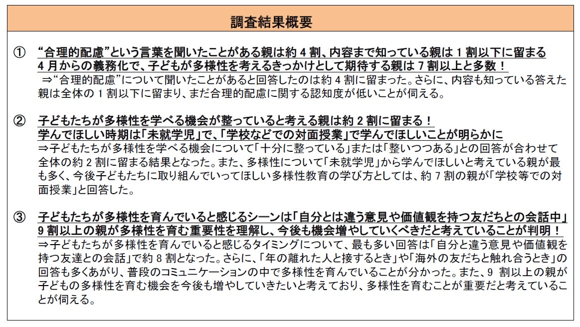 “合理的配慮”を聞いたことがある親は約4割、子どもたちが多様性を学べる機会が整っていると考える親は約2割に留まる「未就学児」から多様性に触れ、「学校などでの対面授業」で学んでほしいと考える親が多数!