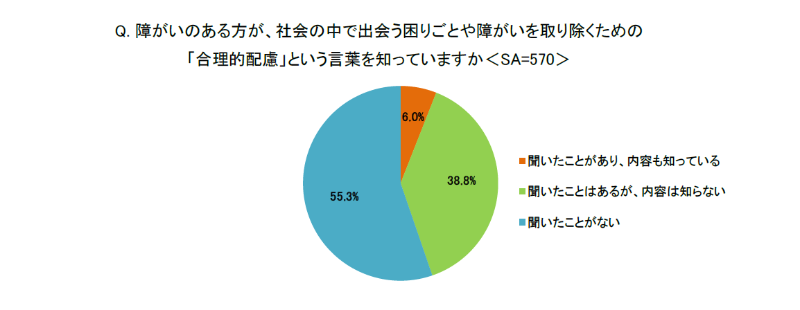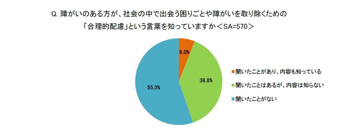 2024年4月から、合理的配慮の提供が義務化されましたが、そのような中子どもを持つ親に「障がいのある方が、社会の中で出会う困りごとや障がいを取り除くための“合理的配慮”という言葉を知っていますか<SA>」と尋ねたところ、「聞いたことがある」(255)と回答した人は約4割に留まりました。さらに、内容も知っている答えた親は全体の1割以下に留まり、まだ合理的配慮に関する認知度が低いことが伺えます。
