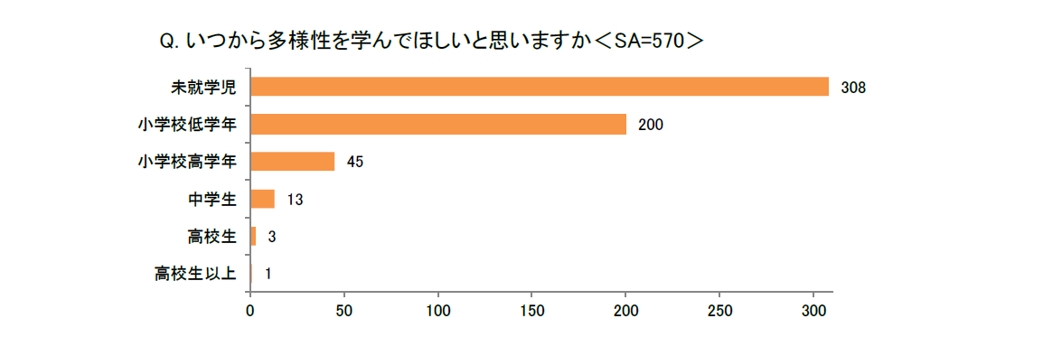 「子どもたちが多様性を学べる機会は十分に整っていると思いますか<SA>」の問では、「十分に整っている」(2)と「整いつつある」(127)を合わせても、全体の約2割に留まる結果となり、まだ多様性について学べる環境が足りていないと考える親が多いことがわかりました。また、「いつから多様性を学んでほしいと思いますか<SA>」の問では、「未就学児」(308)が第1位で最も多く、次いで「小学校低学年」(200)があげられました。この結果から、早い段階から多様性について学ぶ必要があると考えている親が多いことが伺えます。